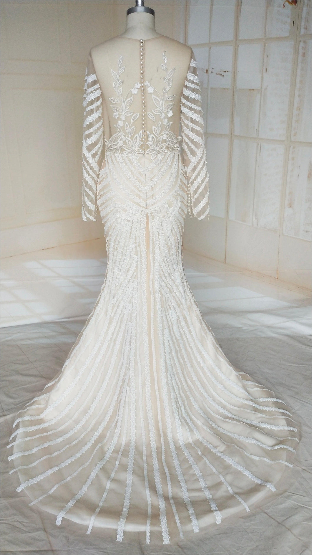 This elegant long sleeve wedding gown was an inspired replications we made for a long distance bride. The original wedding dress was over $8000. Our version of that design came in at $1400. Send us your pictures for pricing.