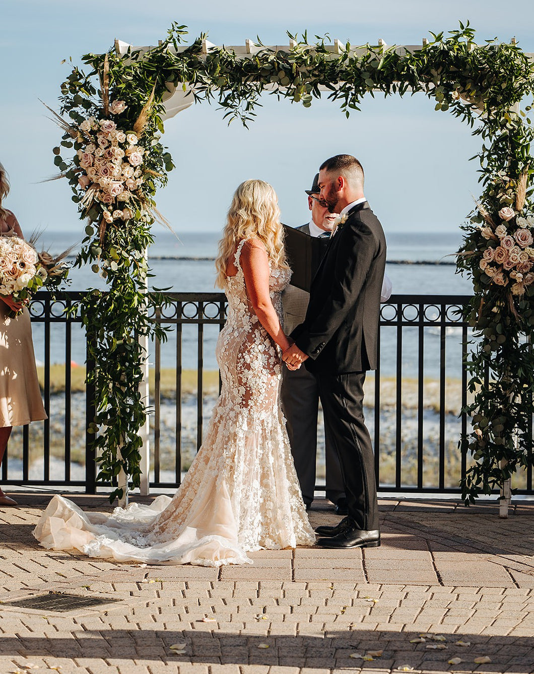 This stunning lace wedding gown features a delicate nude overlay and elegant shoulder straps. Exuding elegance and grace, it is sure to make any bride feel confident and beautiful on her special day. Say "I do" in style with this timeless and sophisticated dress!