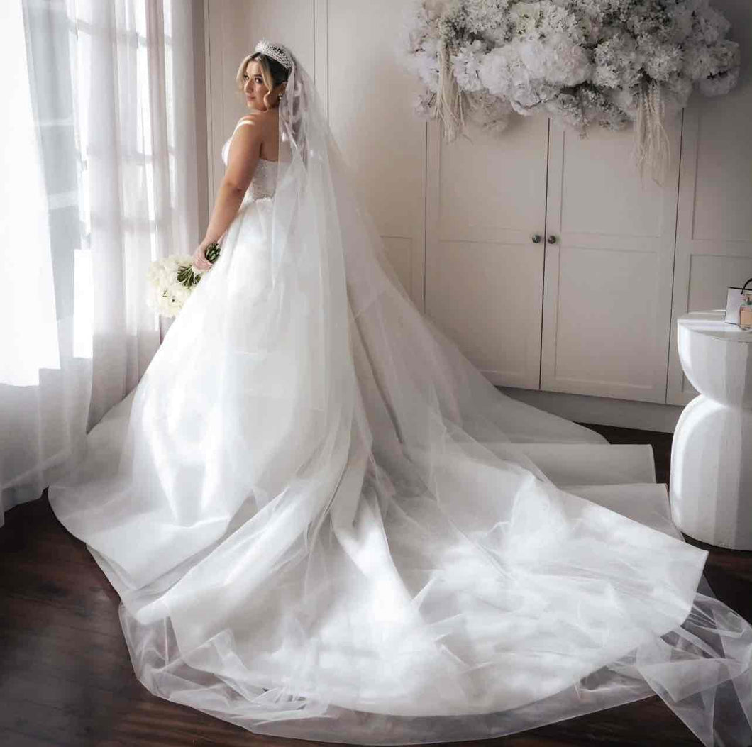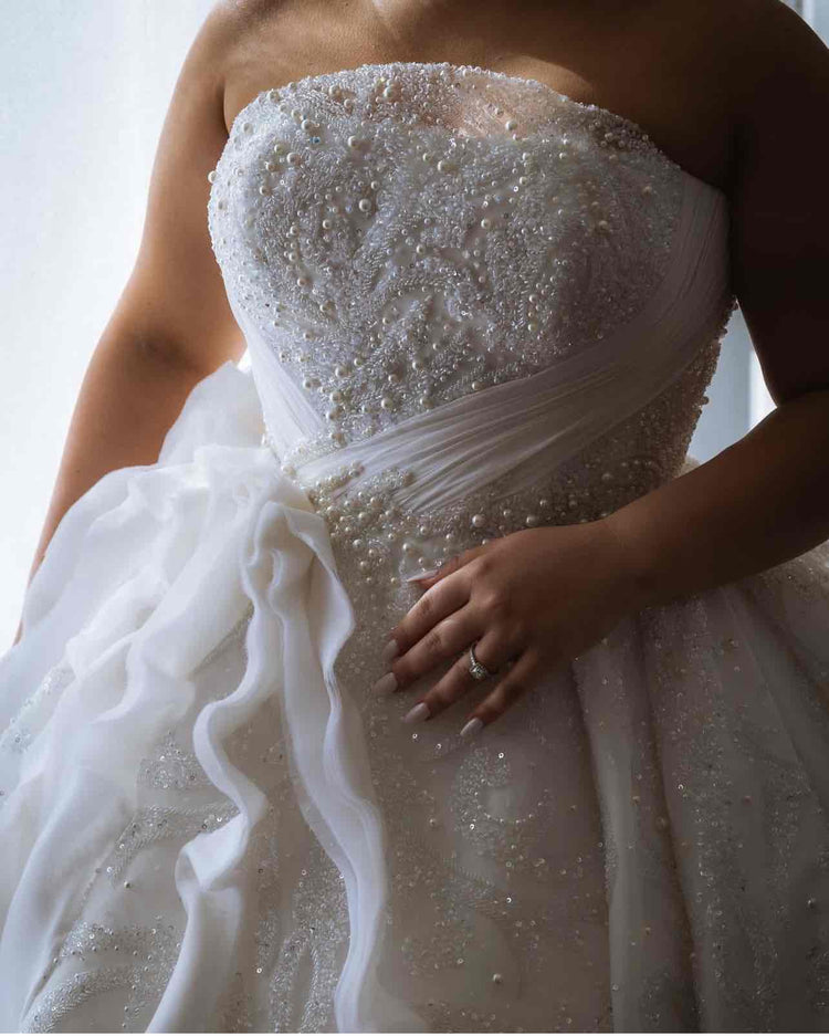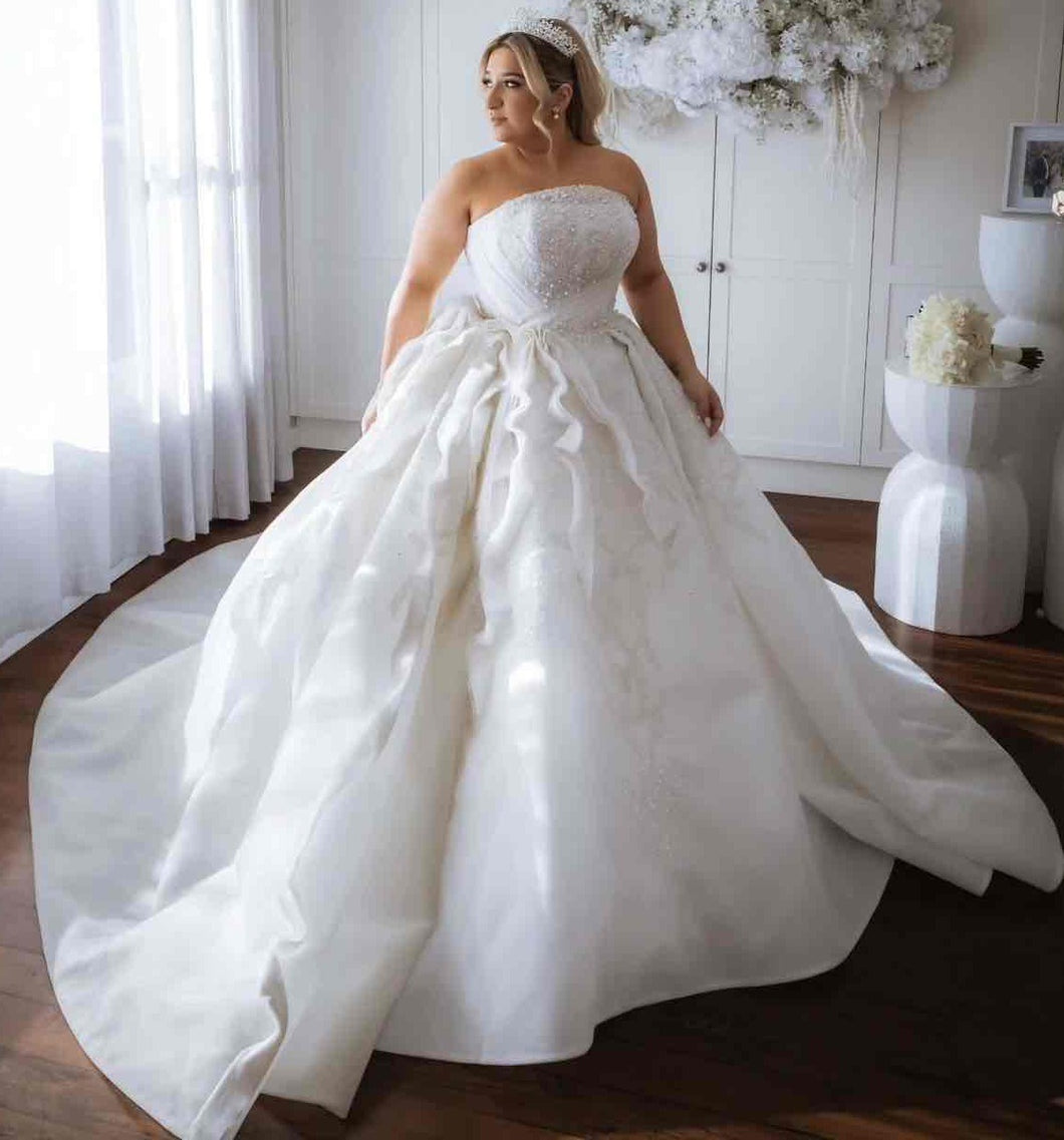Indulge in elegance and sophistication with #style C2024-GH53P ball gown. This #plussize #wedding dress features intricate beading and a strapless design inspired by George Habibeh. Feel luxurious and confident on your #special #weddingday in this stunning gown.
