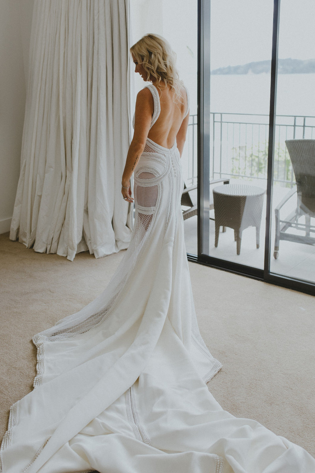 C2024-JT72 - sheer pearl beaded backless wedding gown