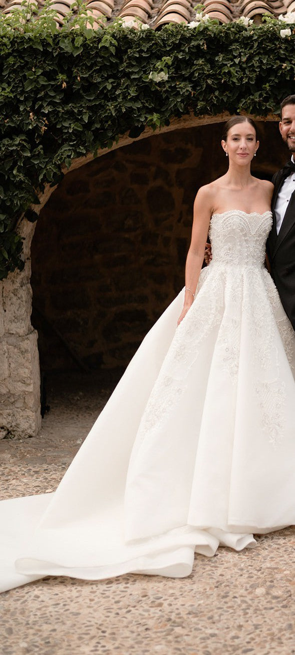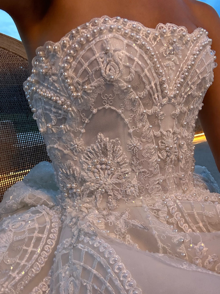 Indulge in the opulent elegance of our C2024-SBG1199 ball gown wedding dress. Featuring a strapless neckline and #beautiful #pearl beaded #lace embellishments, this #dress exudes luxury and sophistication. Make a statement on your #special #weddingday with this exquisite and exclusive #design.
