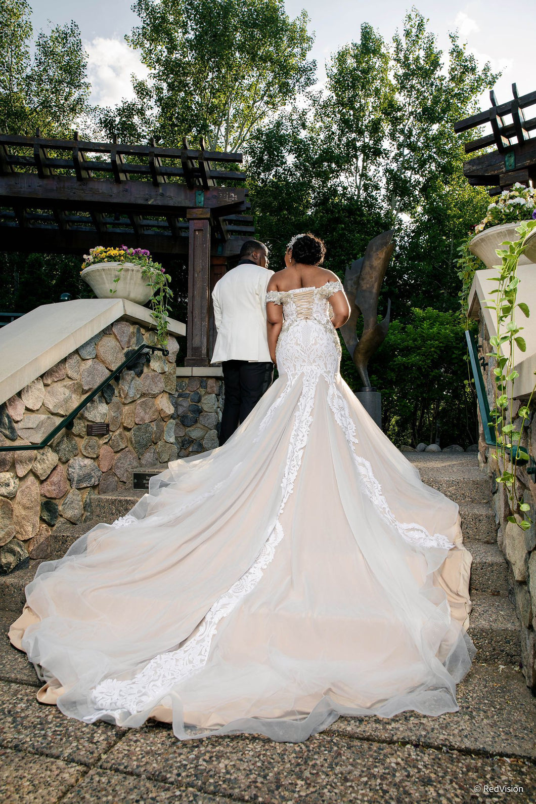 This off-the-shoulder fit-and-flare #wedding gown showcases intricate beadwork and a #graceful chapel train, blending #elegance with #modern #design. Inspired by Esé Azenabor, it highlights refined craftsmanship and a flattering silhouette that enhances your natural shape, making it a #timeless choice for your #special #weddingday.