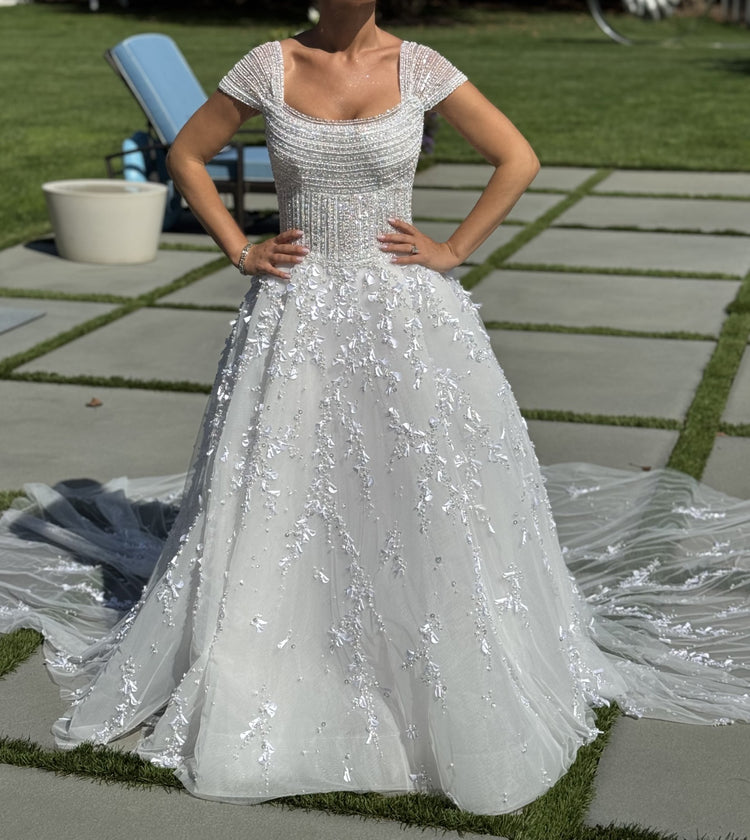 Get this short cap sleeve beaded wedding ball gown made with any custom changes.