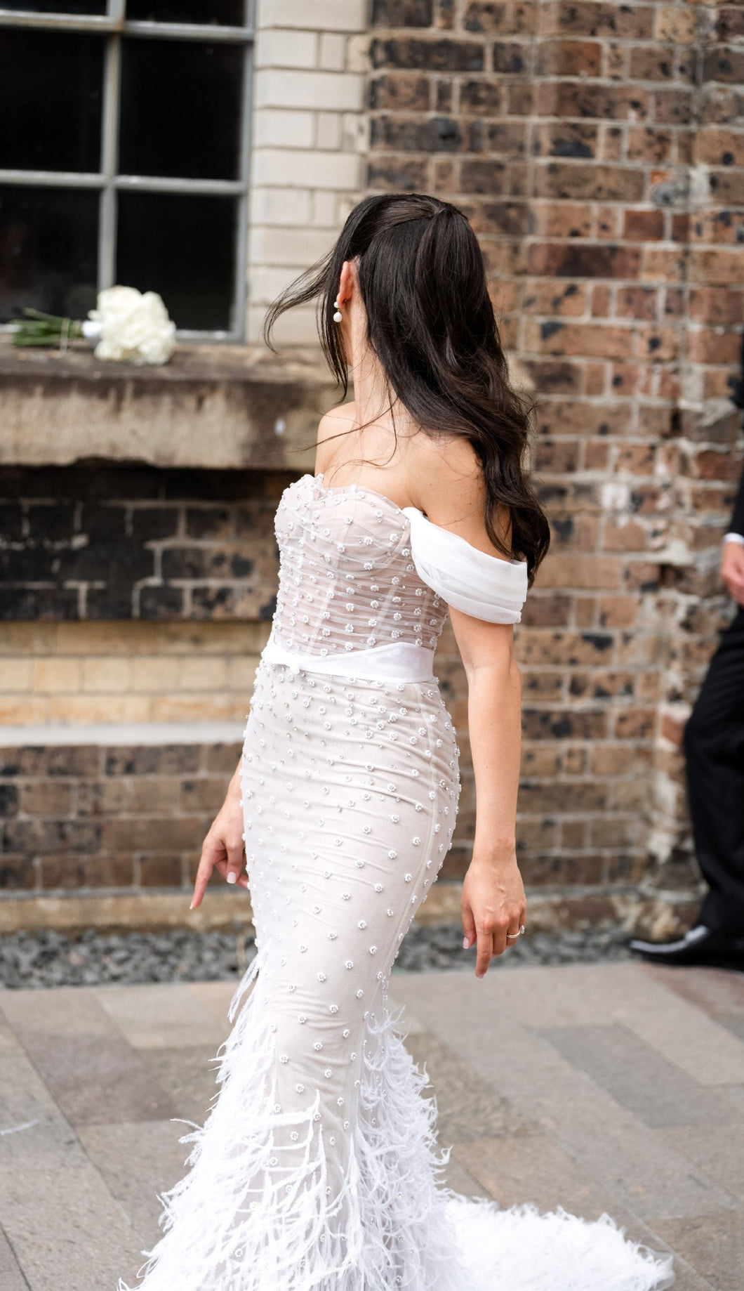 Be the epitome of elegance in #style C2025-LM819 wedding gown! With a delicate off-the-shoulder #design and a figure-flattering fit-to-flare silhouette, this #dress is perfect for any #bride. The embellished bodice and #feather skirt are inspired by the Jean design by Liz Martinez, making it a dreamy and #unique choice for your #special #weddingday. Feel like a true queen in this stunning dress - #grace, #beauty, and romance all in one!