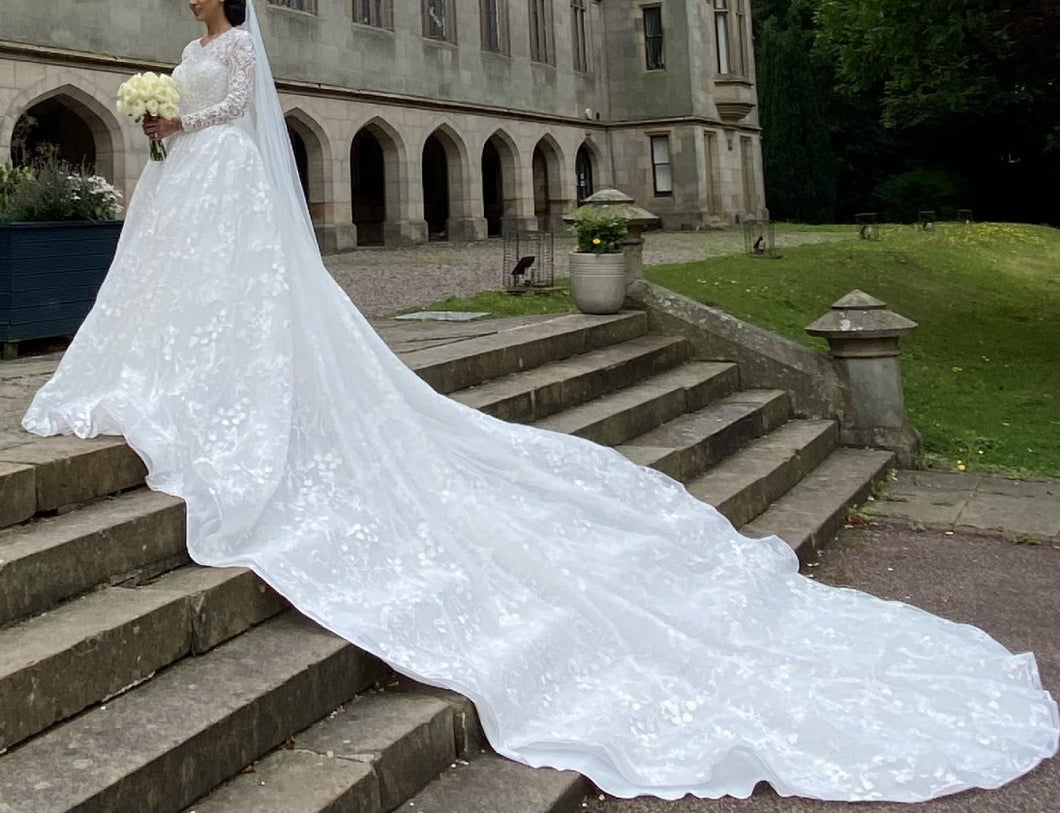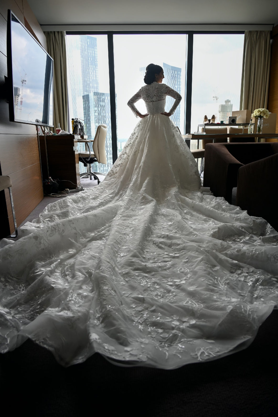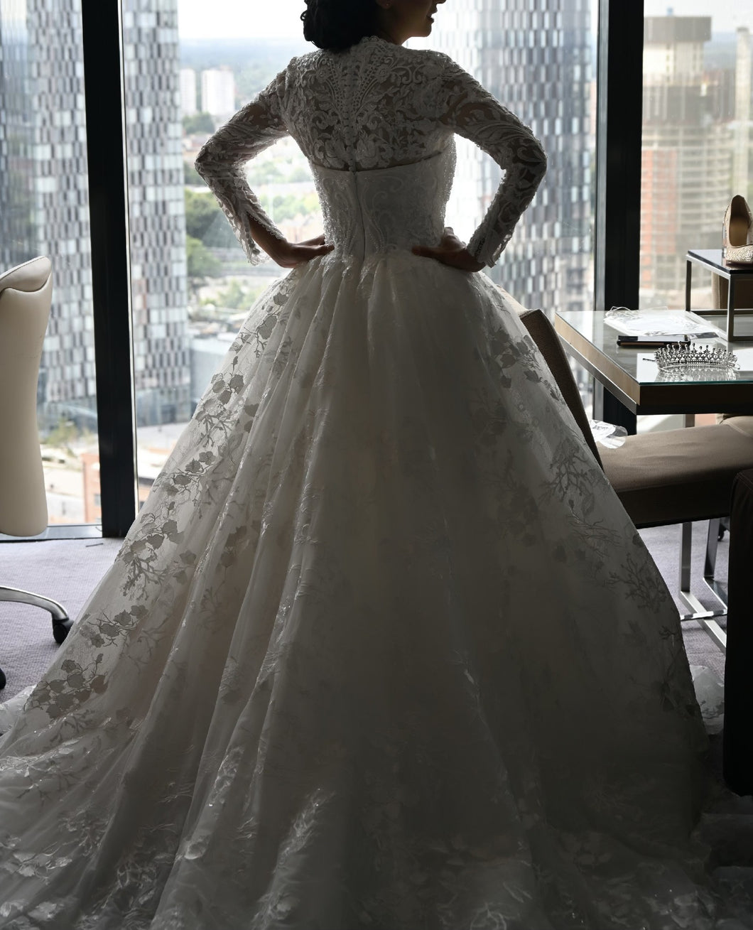 Indulge in elegance and grace with #style C2025-PLS398 #wedding gown. The intricate embroidery and long sleeves create a #modest and #timeless look, perfect for a Church ceremony. Inspired by Pronovias, this gown exudes sophistication and luxury, making you the center of attention on your #special #weddingday.