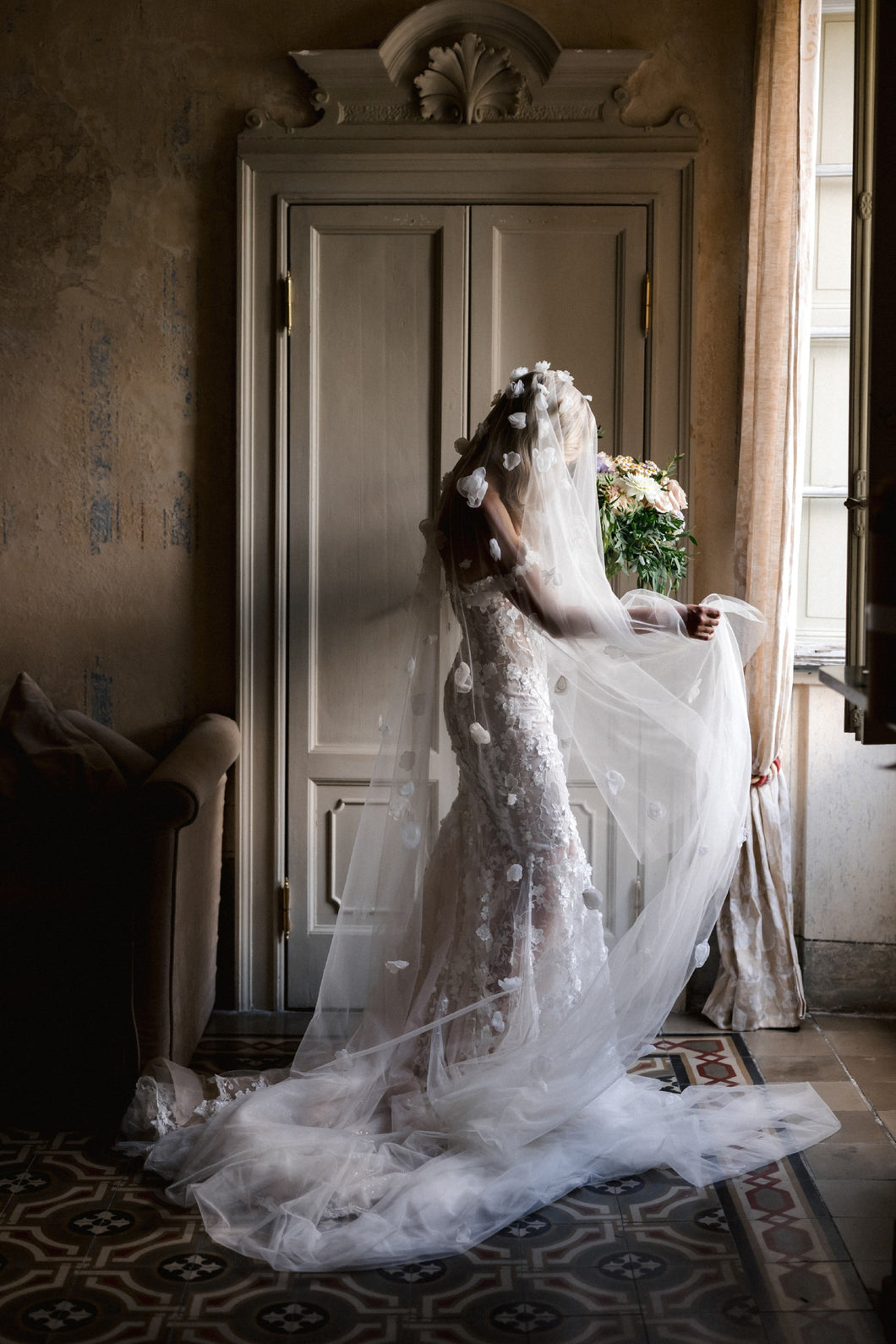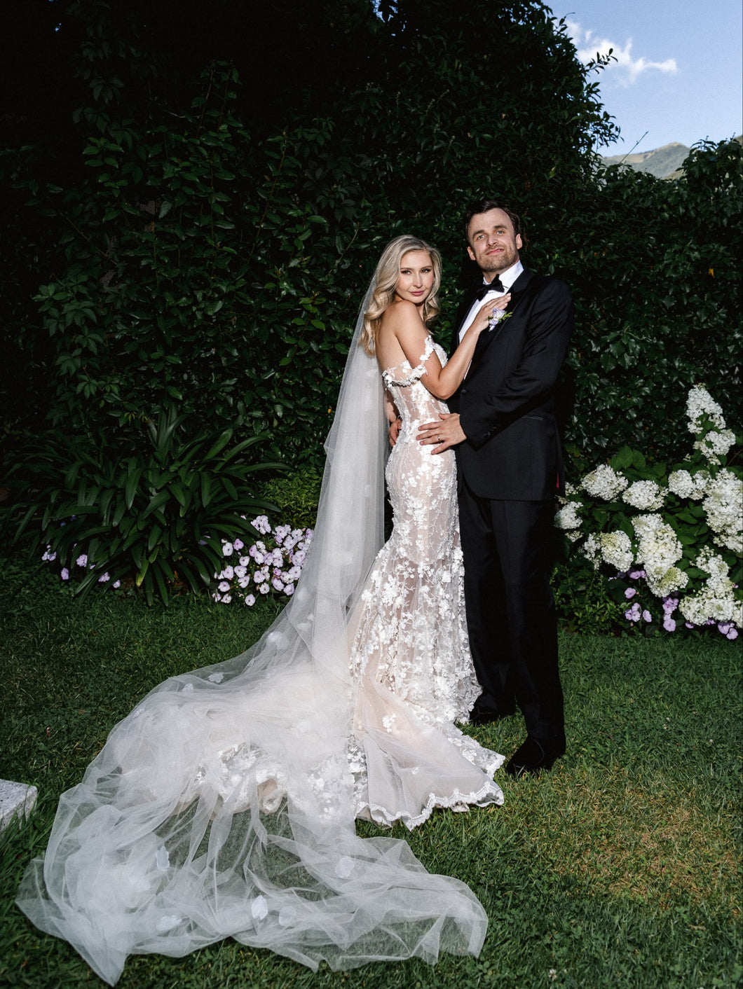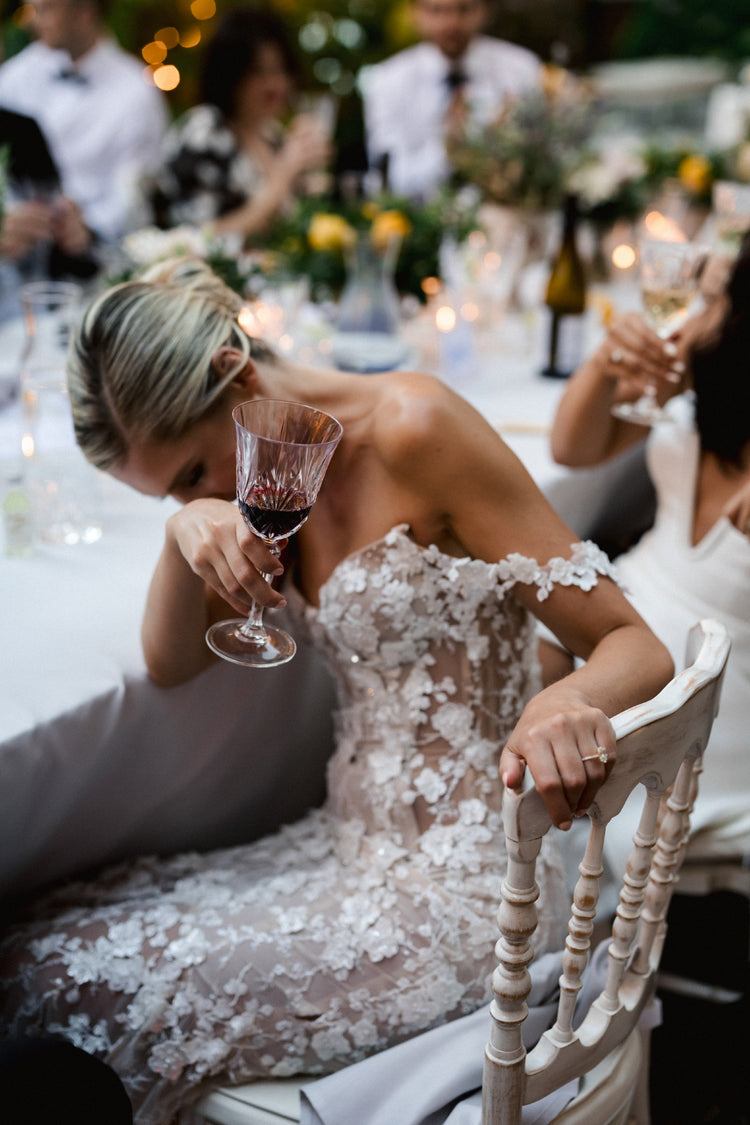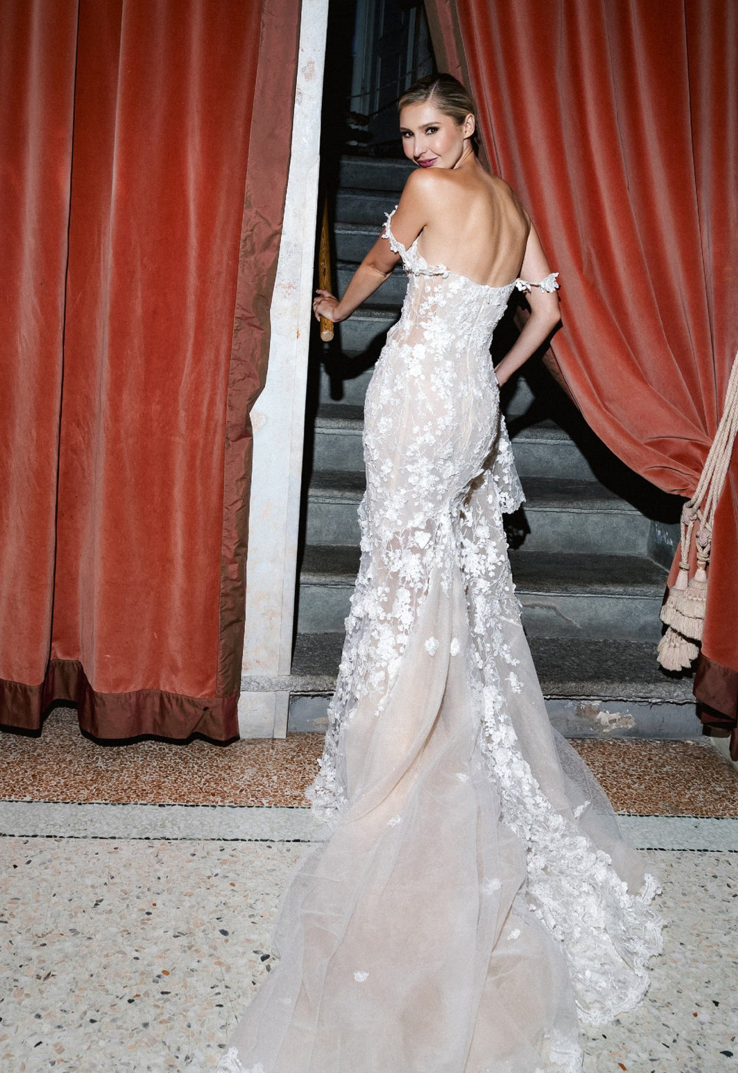 Recorre la habitación con este impresionante vestido de novia bordado con hombros descubiertos, que irradia elegancia y sofisticación. Con delicados bordados y un favorecedor escote en los hombros, este vestido es perfecto para la novia moderna que busca un toque de lujo en su día especial.