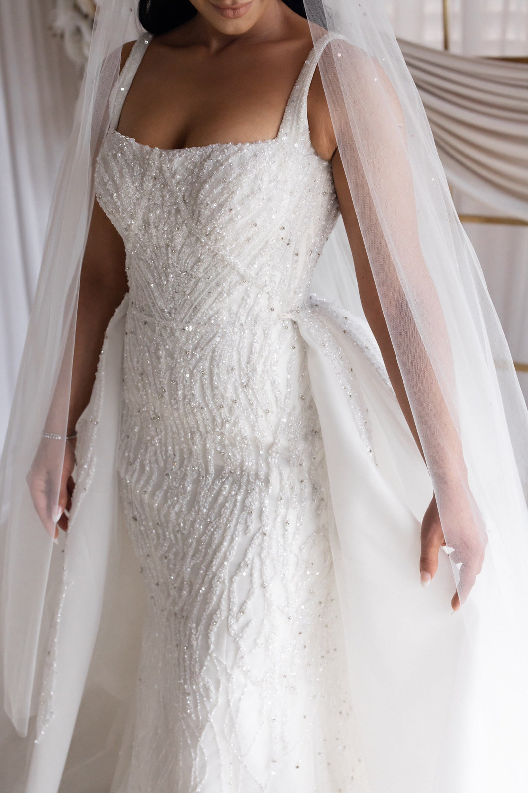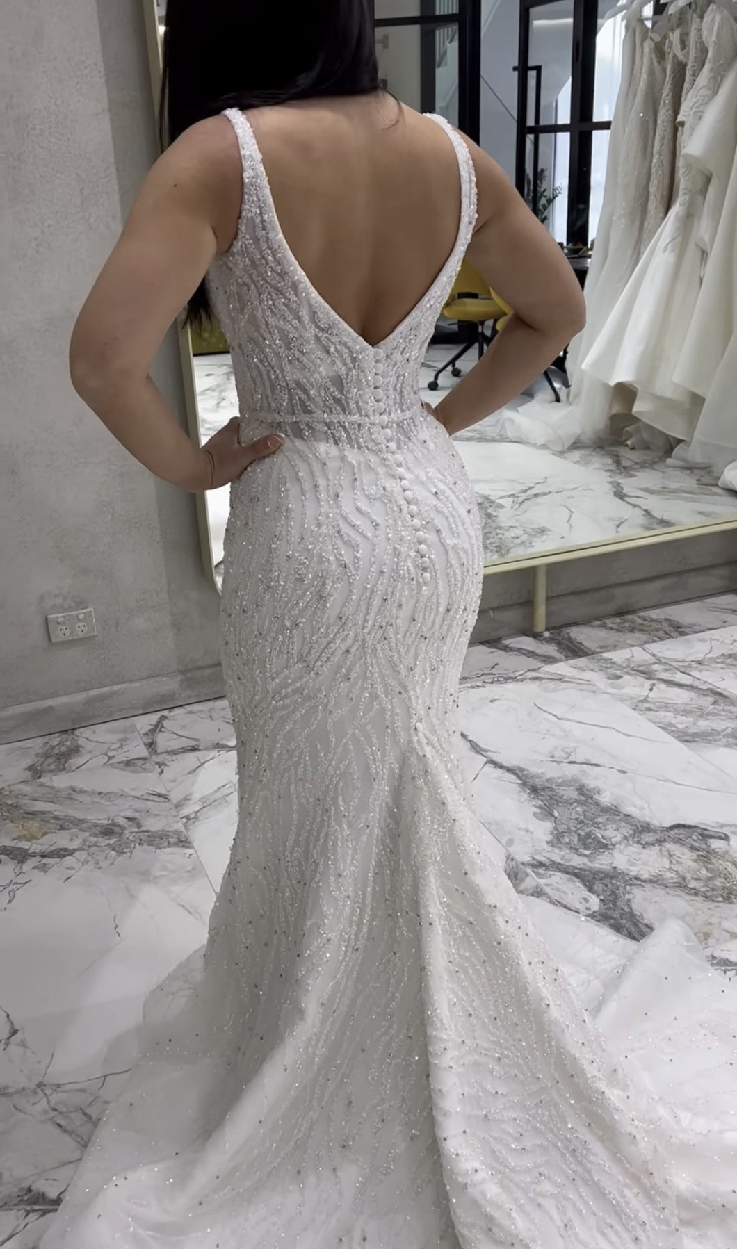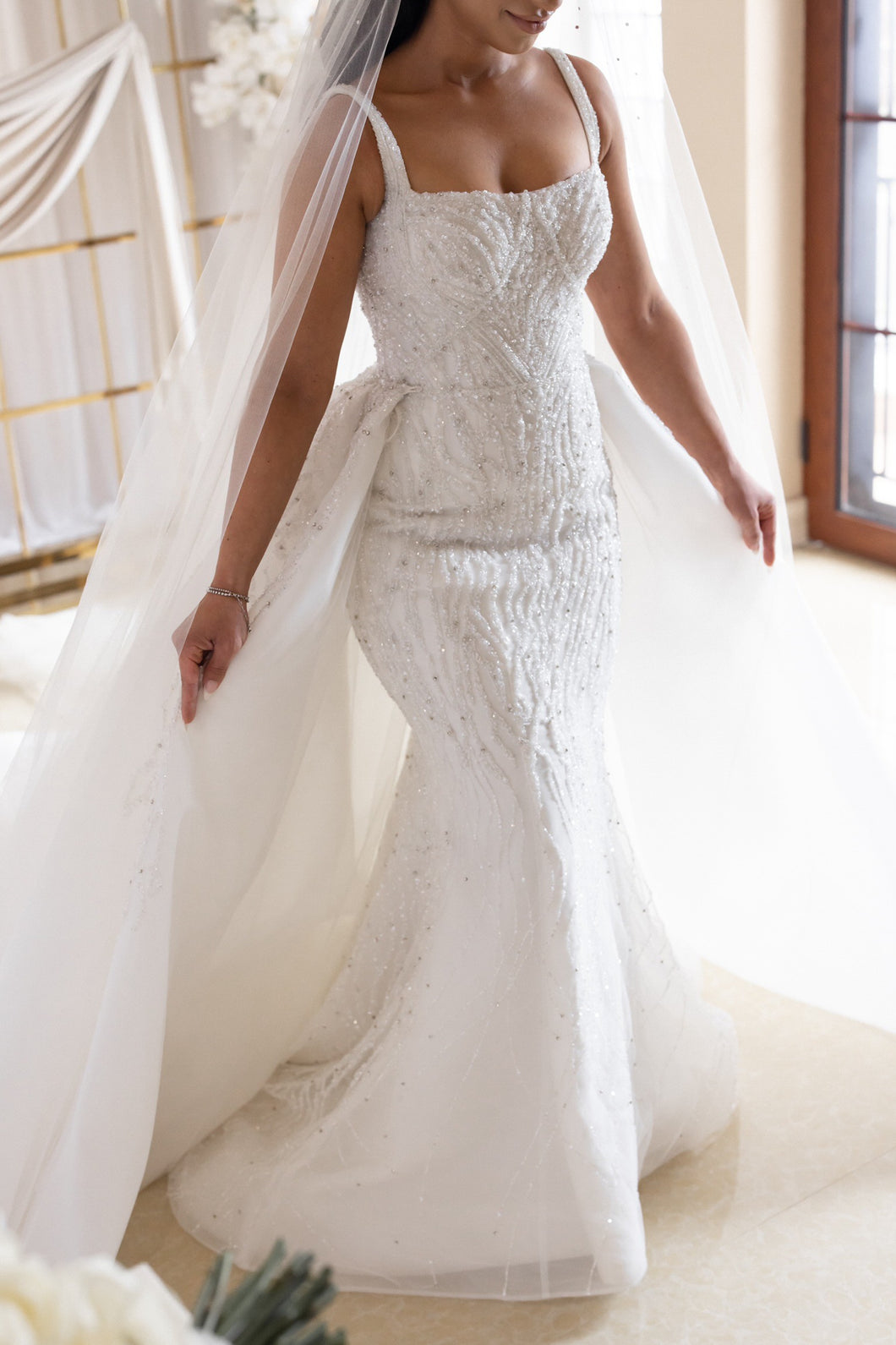 Disfrute del lujo en su día especial con nuestro vestido de novia C2024-SB44. Esta obra maestra sin mangas presenta un intrincado trabajo de cuentas y una atractiva línea de busto abierta que irradia elegancia. La cola desmontable añade un toque de glamour y te convierte en el centro de atención. Di "Sí, quiero" con estilo.
