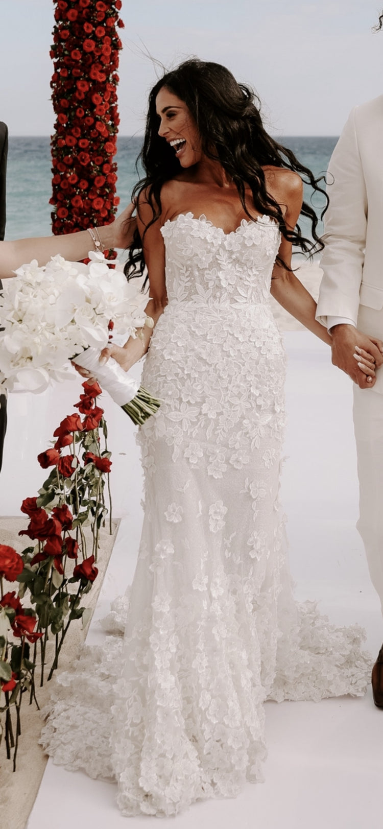 Consigue este vestido de novia fluido sin tirantes con adornos de encaje de pedrería con CUALQUIER cambio de #diseño.