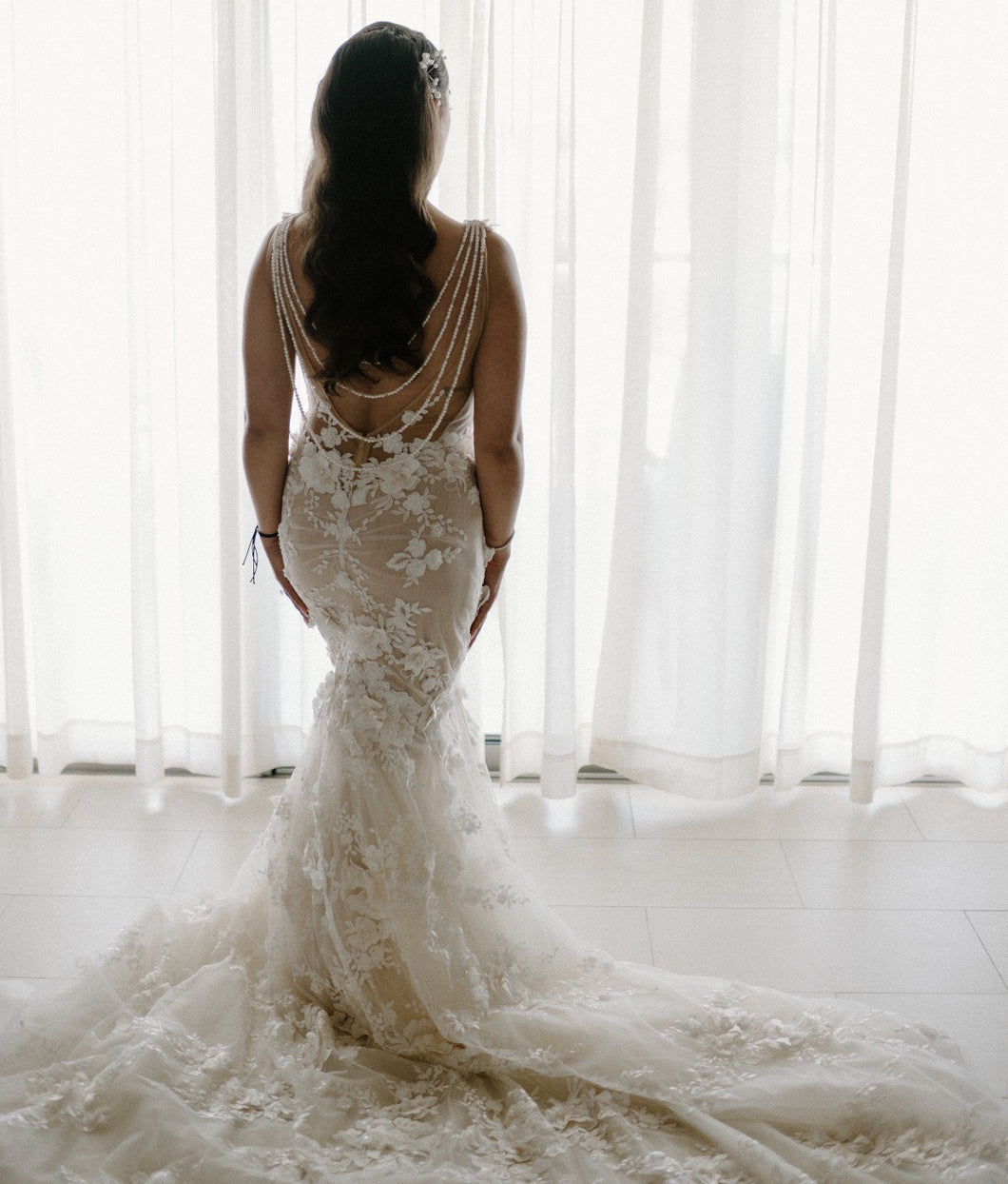 Abrace la elegancia y la sofisticación con nuestro vestido de novia C2024-VN61. El busto sin mangas con cuello en V acentúa tu figura, mientras que la capucha drapeada de perlas añade un toque de lujo. Completa el look con el impresionante detalle de espalda abierta. Di "Sí, quiero" con estilo con esta pieza exclusiva.