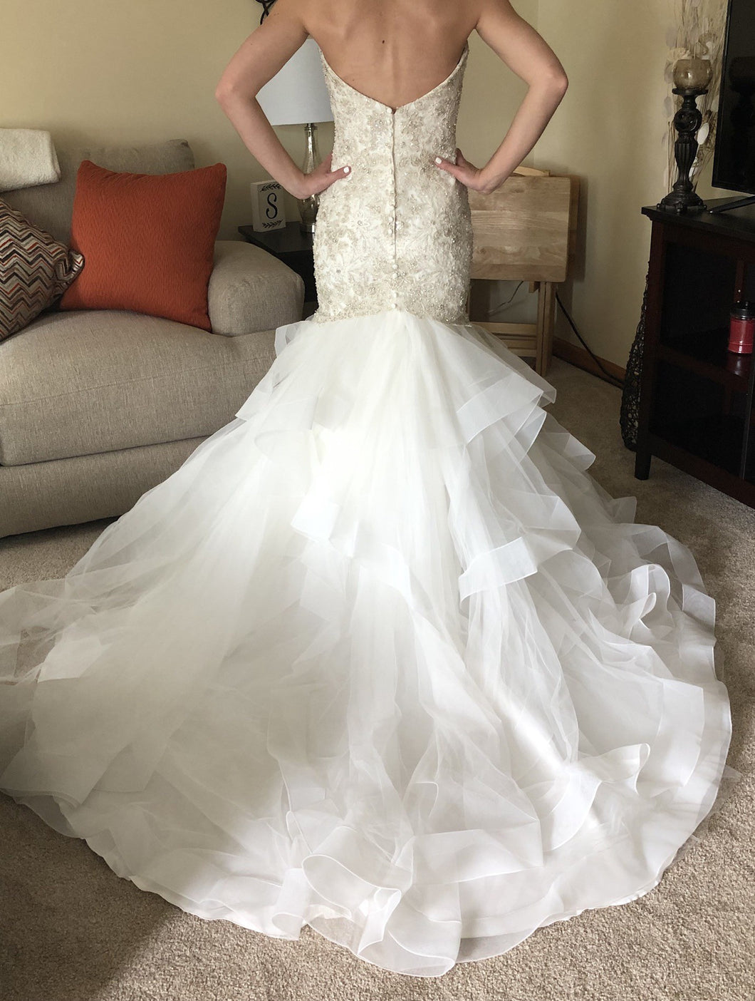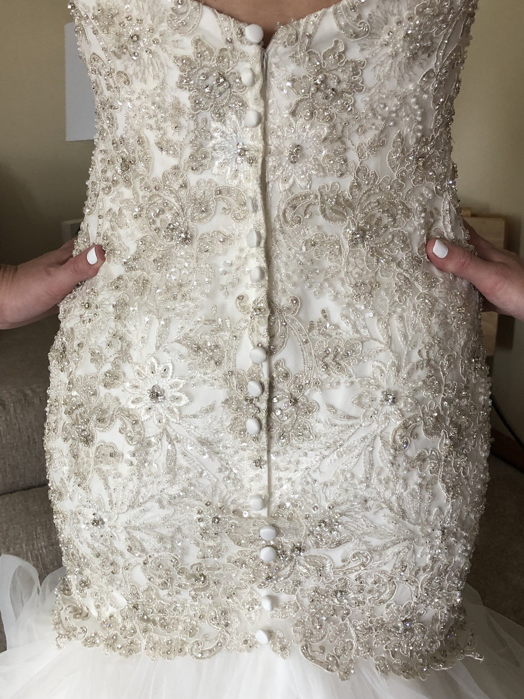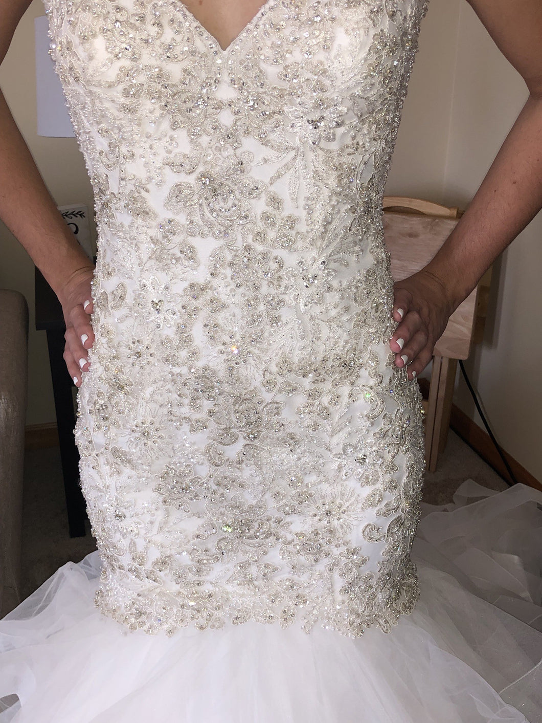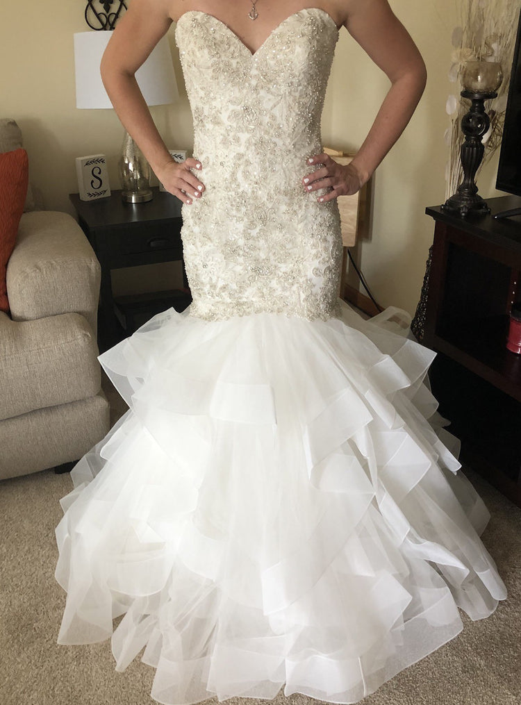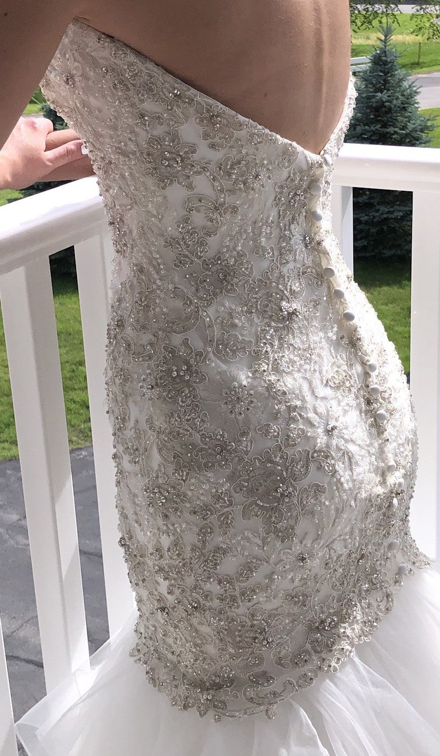 Elevate your bridal look with Style 9421 - a strapless fit-to-flare wedding gown exquisitely crafted with a beaded lace bodice. The sweetheart neckline adds a touch of romance, while the figure-flattering silhouette accentuates your curves. Walk down the aisle in this luxurious, one-of-a-kind gown and make a statement on your special day.