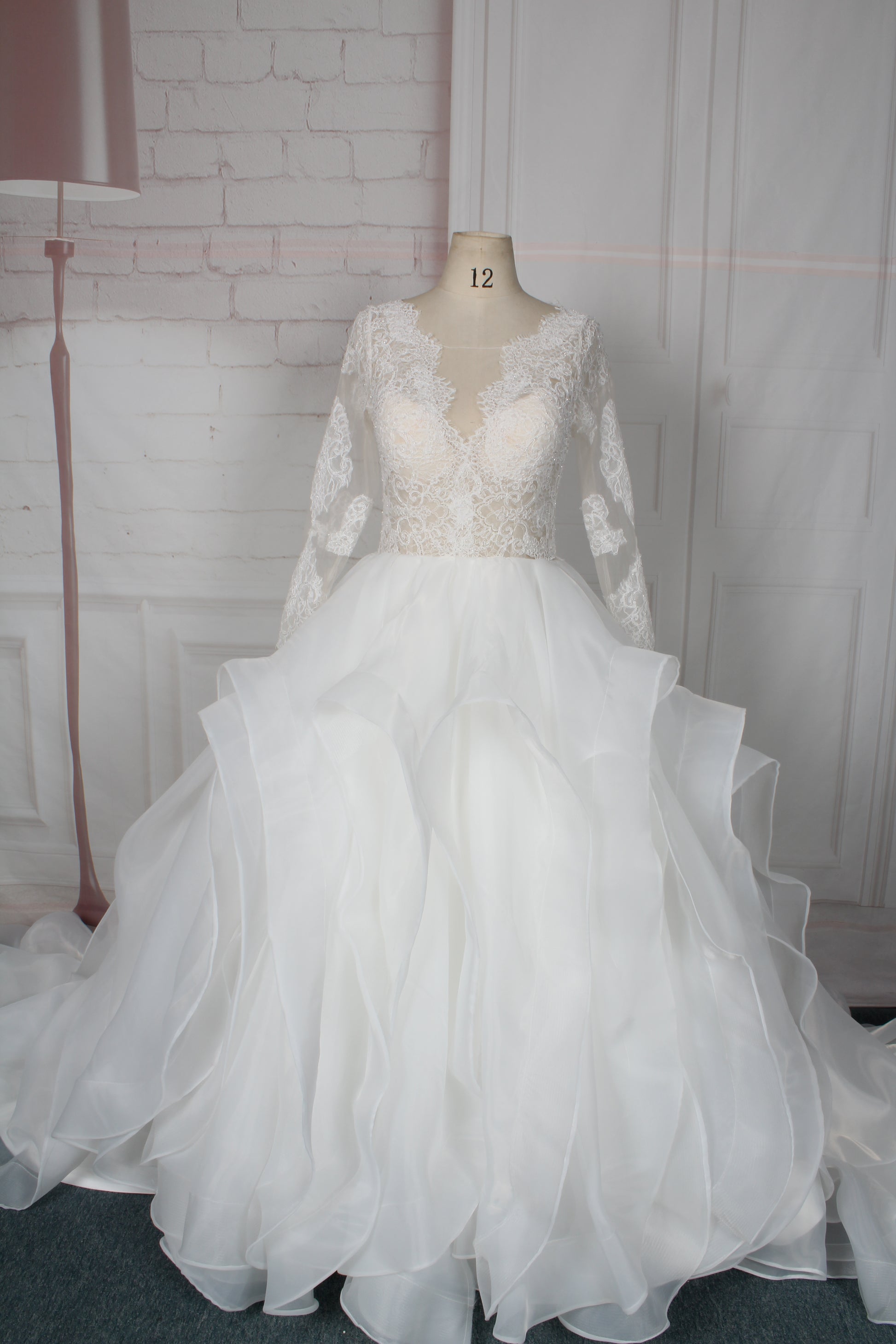 Este vestido de novia de encaje de manga larga con falda de volantes se puede confeccionar en cualquier talla y con cualquier cambio.