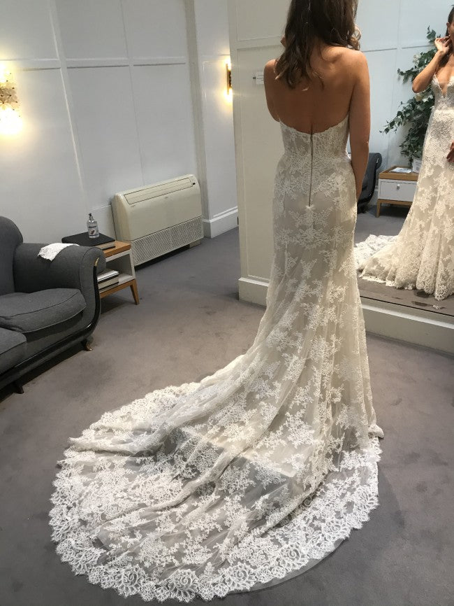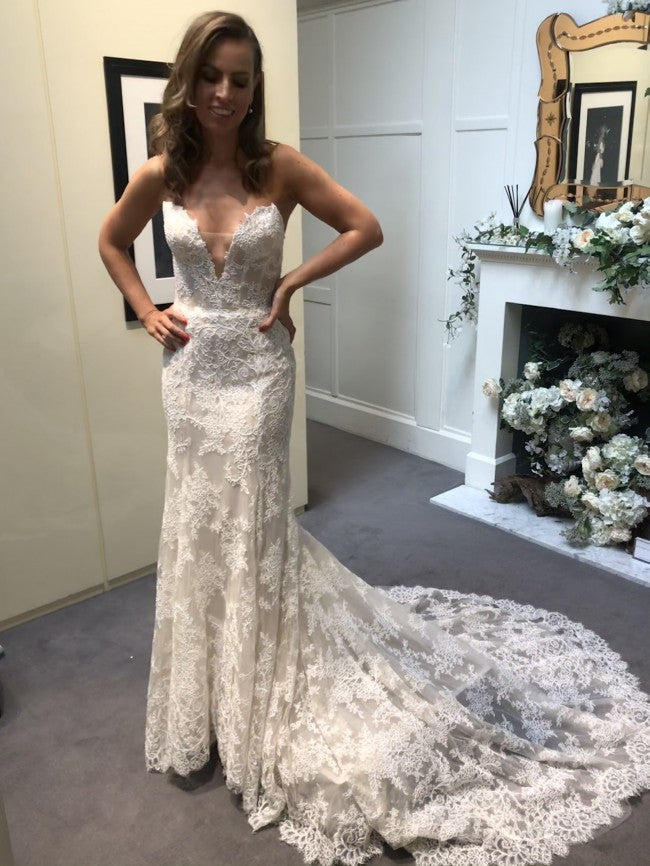 Aquí tienes un delicado vestido de novia de encaje sin tirantes con cola catedral que puedes comprar como se muestra en la imagen o con cualquier cambio de diseño que necesites. Agregar #bling también es siempre una opción.