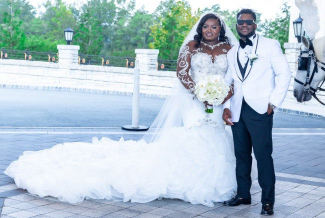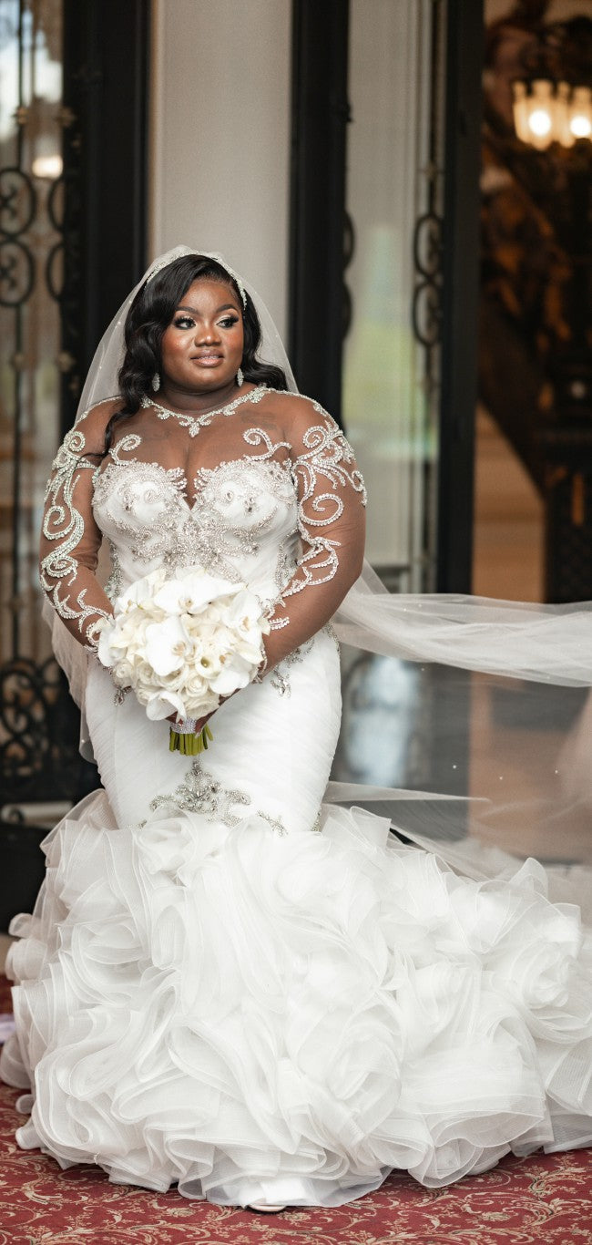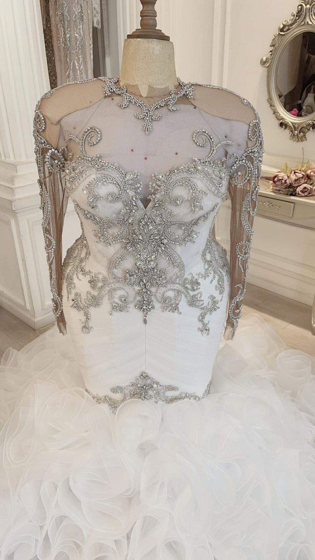 Puede encargar este vestido de novia de talla grande, entallado y con vuelo, con pedrería, escote ilusión transparente, mangas largas y adornos brillantes, hecho a pedido como se muestra o con cualquier cambio por un precio razonable con nuestra firma de #diseño de #vestidos #americanos.