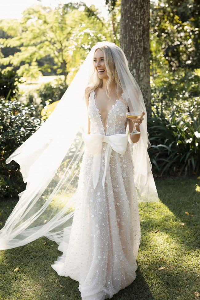 C2022-SV553: vestido de novia sexy, sin mangas, con escote en V profundo y lazo.