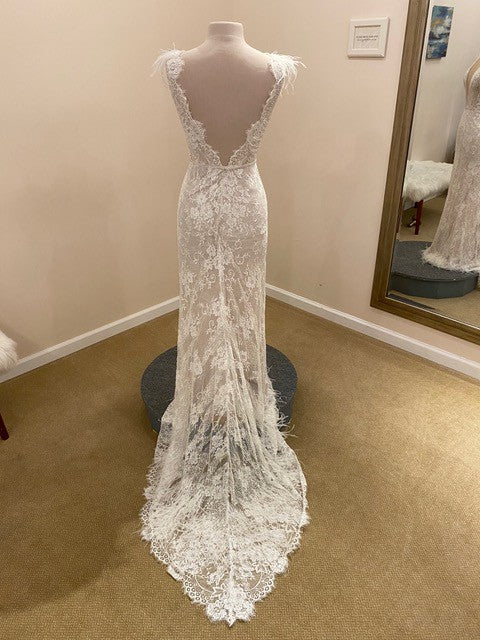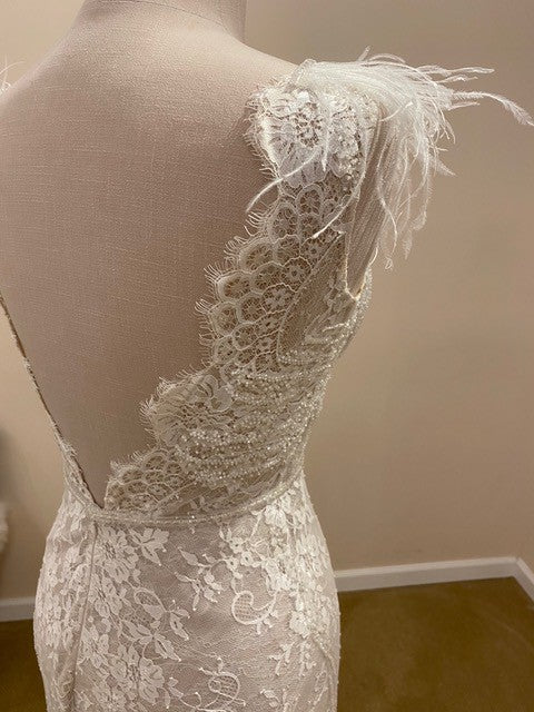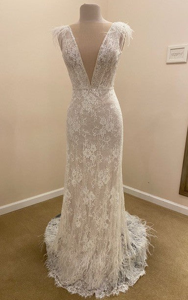 C2022-VF004 sexy vestido de novia ajustado con cuello en V y mangas casquillo de plumas