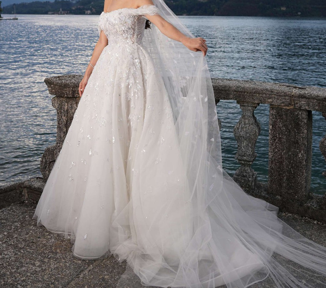 Este vestido de novia de ensueño es la elección perfecta para un look atemporal. El diseño de corte A con hombros descubiertos y talla grande con cuentas es a la vez sofisticado y elegante, lo que lo convierte en una pieza de alta costura digna de un glamoroso paseo hasta el altar. Con su exquisita artesanía y su favorecedor ajuste que realza la figura, este vestido seguramente te hará brillar en tu día especial.