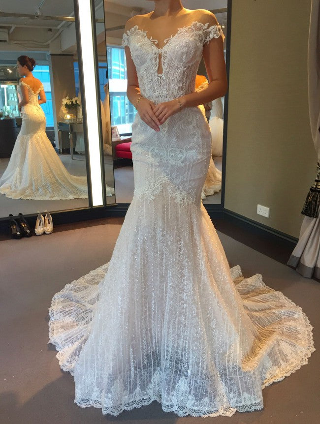 Este vestido de novia de encaje con vuelo y pedrería, con hombros descubiertos, se puede confeccionar como se muestra o con cualquier cambio de #diseño.