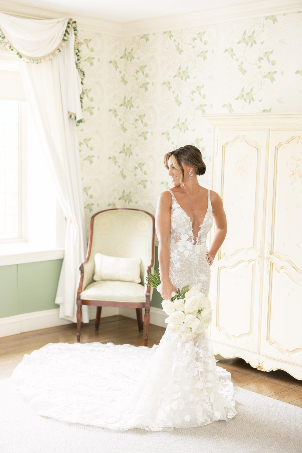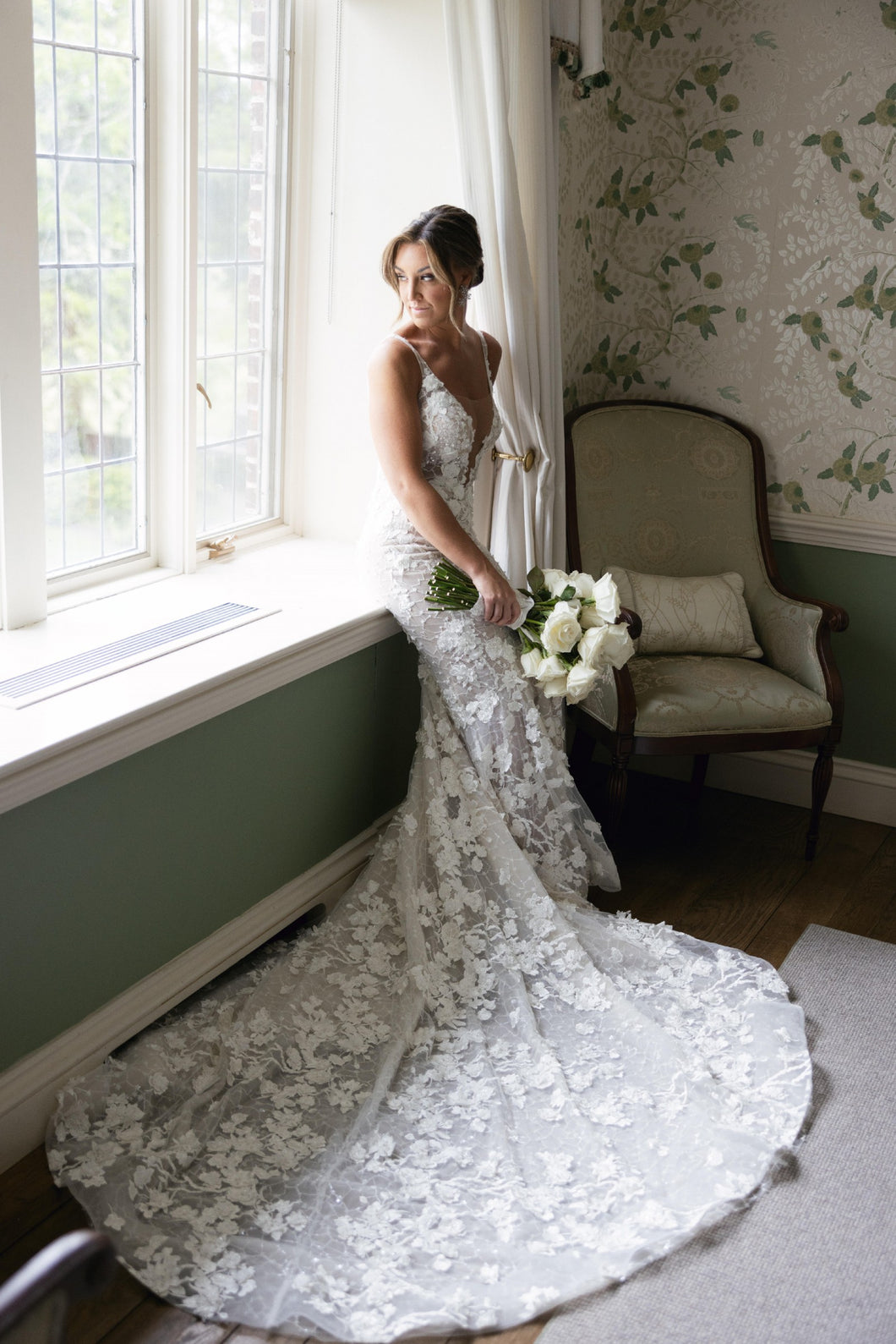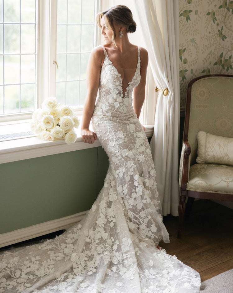 El intrincado bordado de encaje de pedrería y el favorecedor escote en V de este vestido de novia te harán brillar en tu día especial. Combinando a la perfección elegancia y lujo, este vestido te hará sentir como si estuvieras caminando por la alfombra roja.