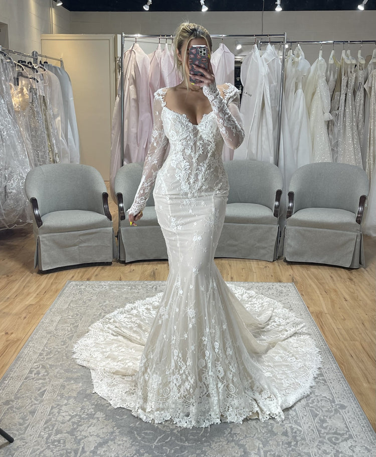 Este precioso vestido de novia de encaje con pedrería presenta un corpiño de manga larga sin espalda y una línea de busto abierta para mayor elegancia. Los intrincados detalles de encaje lo convierten en una opción atemporal y sofisticada para ese día especial. Haz una declaración con esta hermosa pieza atemporal.