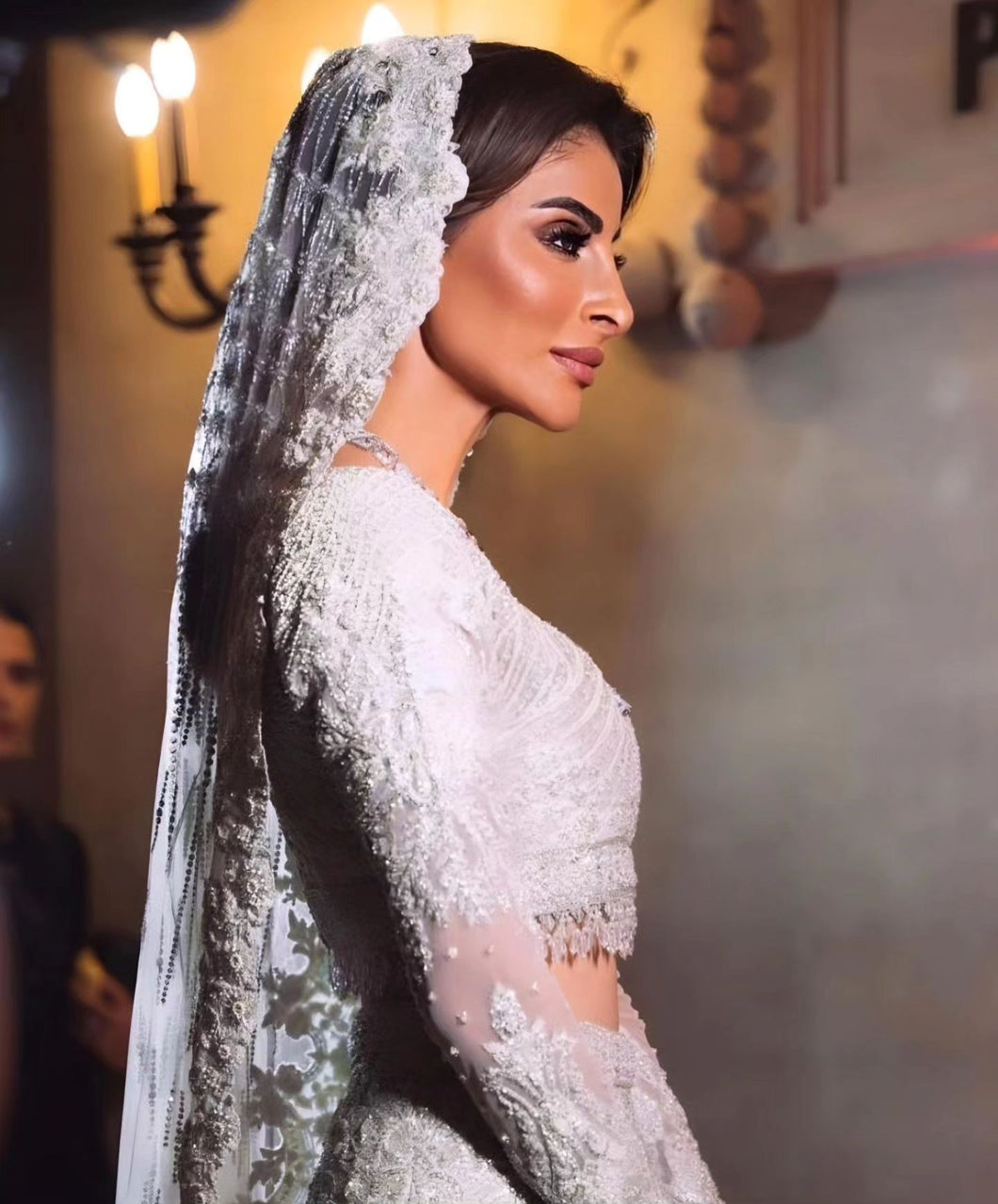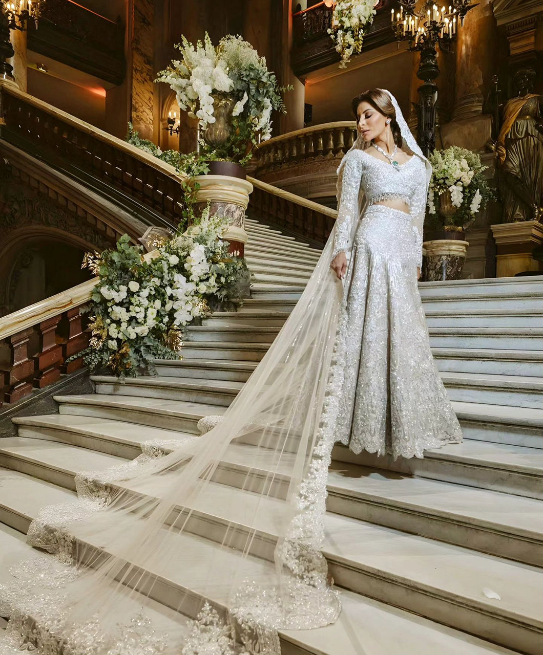 C2023-LS2V9 - Conjunto de vestido de novia de dos piezas de manga larga con bordado adornado y velo