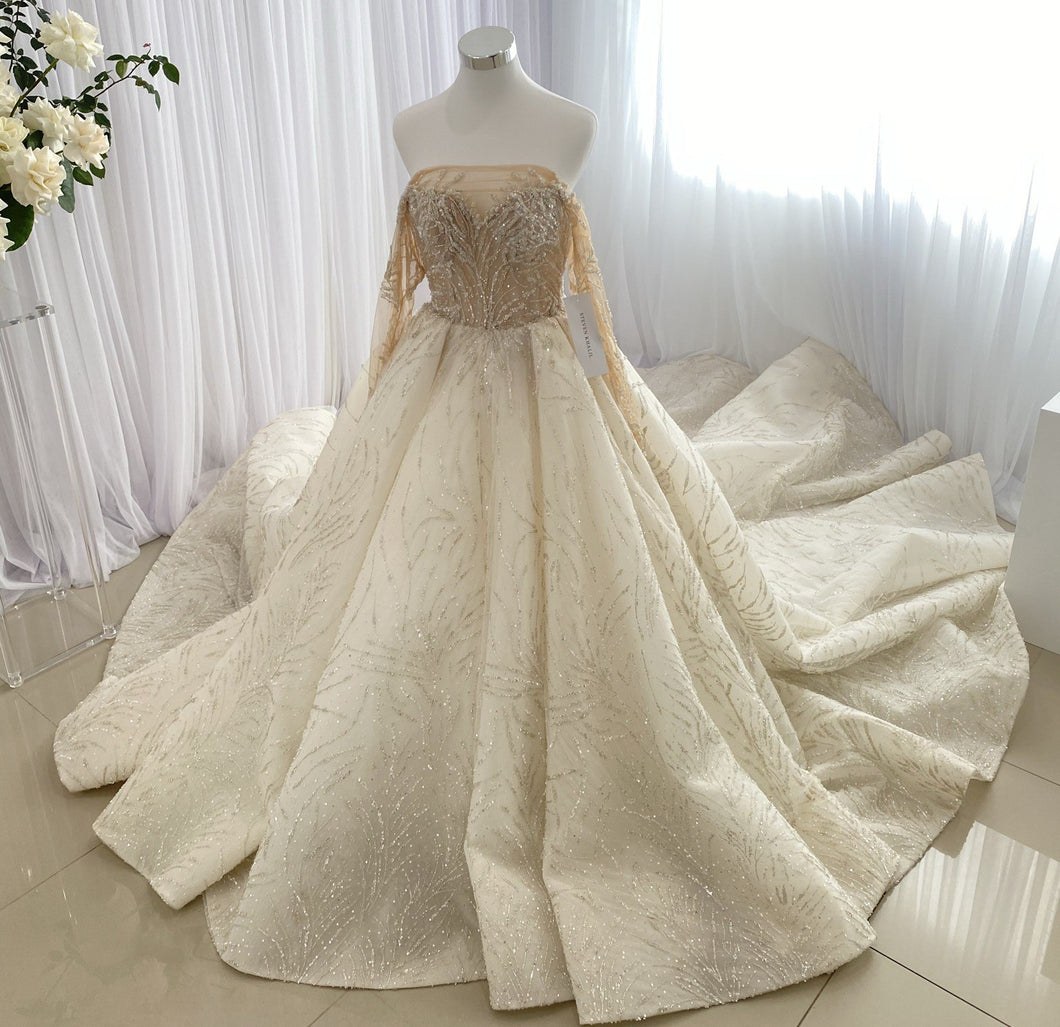 C2023-LS31A - Vestido de novia evasé de manga larga transparente con pedrería