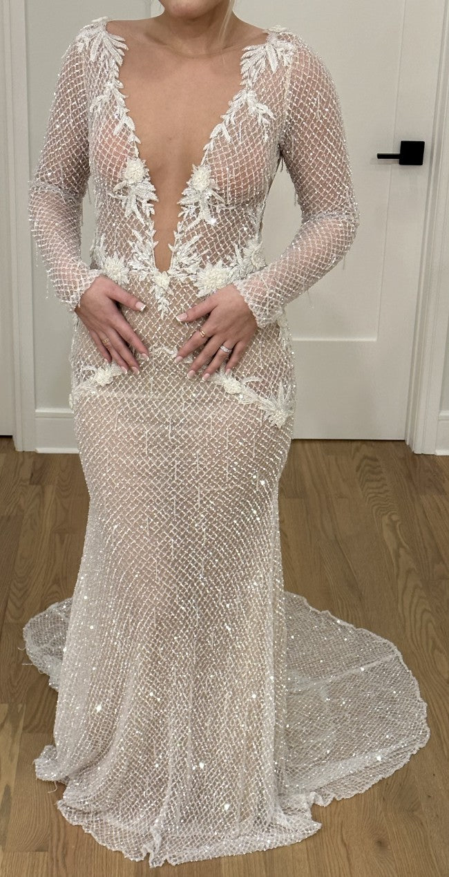Este sexy vestido de novia de manga larga con pedrería y cuello en V tiene la espalda abierta y una sobrefalda desmontable.