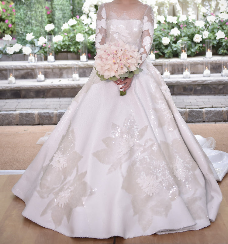 Un clásico atemporal, este exquisito vestido de novia está diseñado con un elegante escote ilusión transparente y mangas largas y fluidas. La combinación perfecta de elegancia y gracia se reúne en este lujoso vestido de fiesta que te hará sentir como una princesa de cuento de hadas en tu día especial.