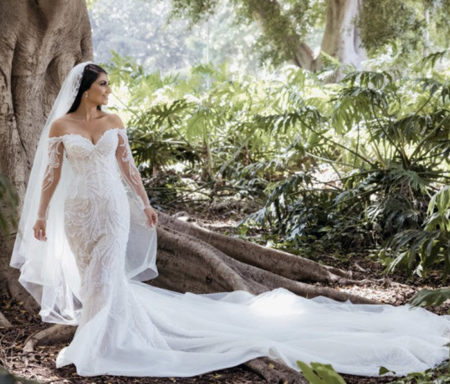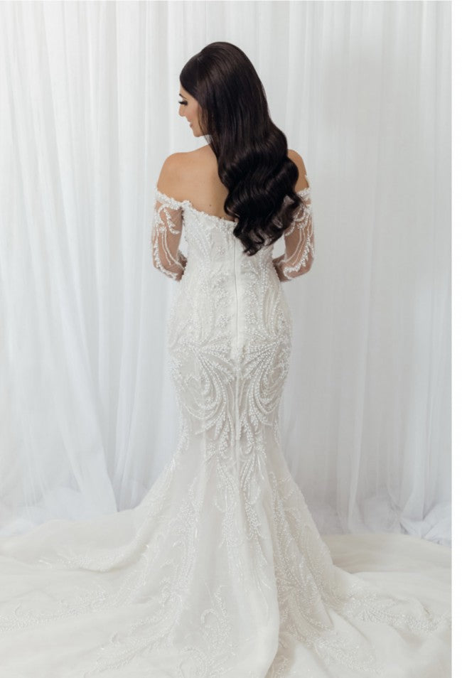 Este vestido de novia de manga larga con hombros descubiertos y pedrería se puede confeccionar como se muestra o con cualquier cambio de diseño.