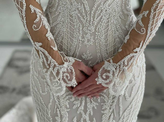 C2023-LSB770S - Vestido de novia de diseñador con pedrería, manga larga transparente y cola catedral