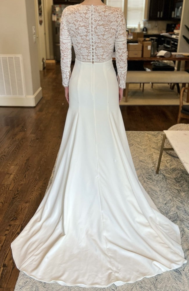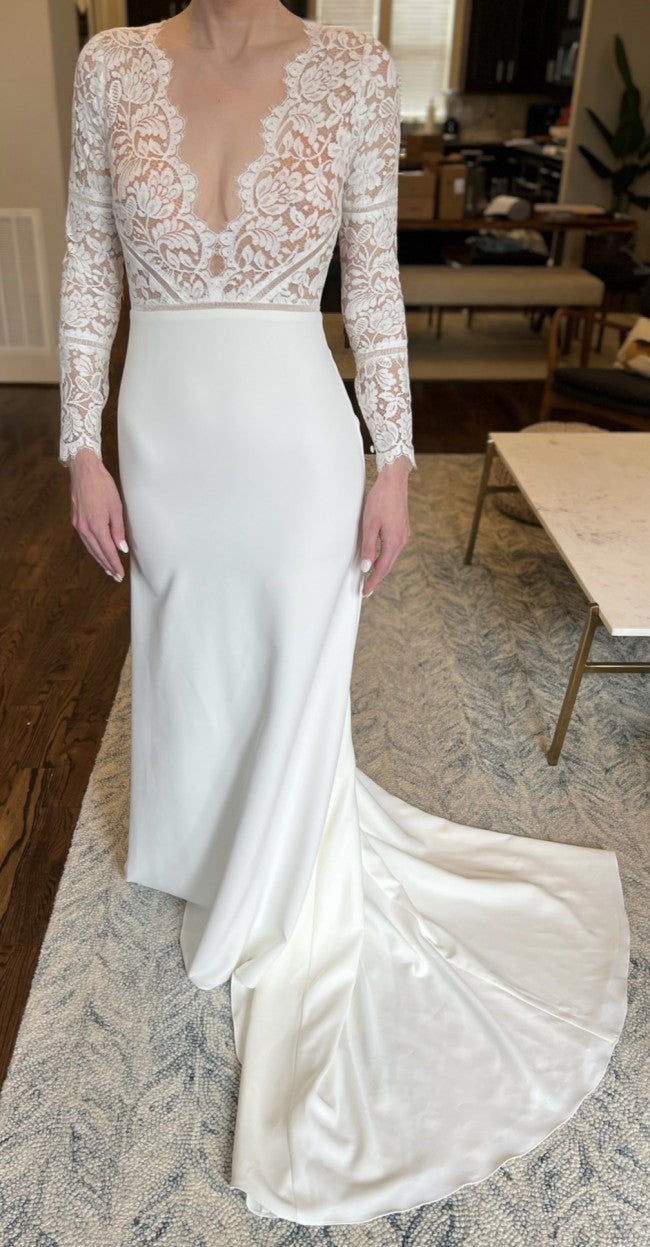 Este exquisito vestido de novia presenta un sexy escote en V transparente y mangas largas ajustadas confeccionadas con lujoso encaje. La silueta ajustada y la espalda cerrada brindan un look atemporal pero moderno, perfecto para cualquier boda.