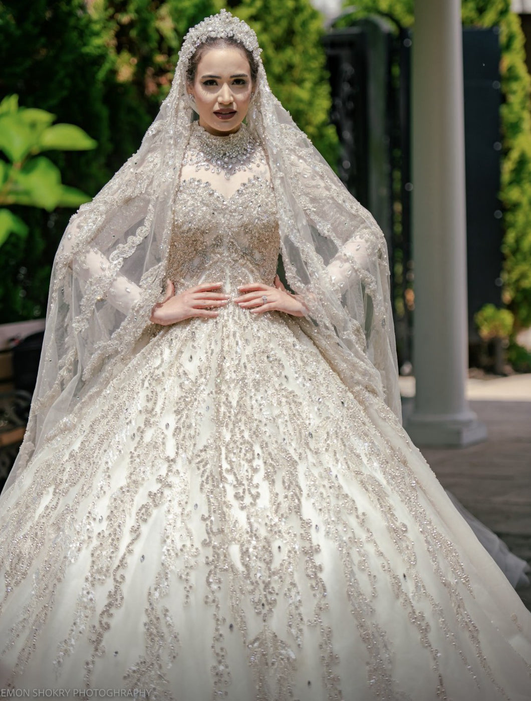 Experimente una elegancia extraordinaria con este exquisito vestido de novia de manga larga con cuentas de cristal Swarovski. Con cuello alto y silueta modesta, este lujoso vestido seguramente llamará la atención. Elaborado con exquisita atención al detalle, este glamuroso conjunto será un complemento inolvidable para cualquier ocasión especial.
