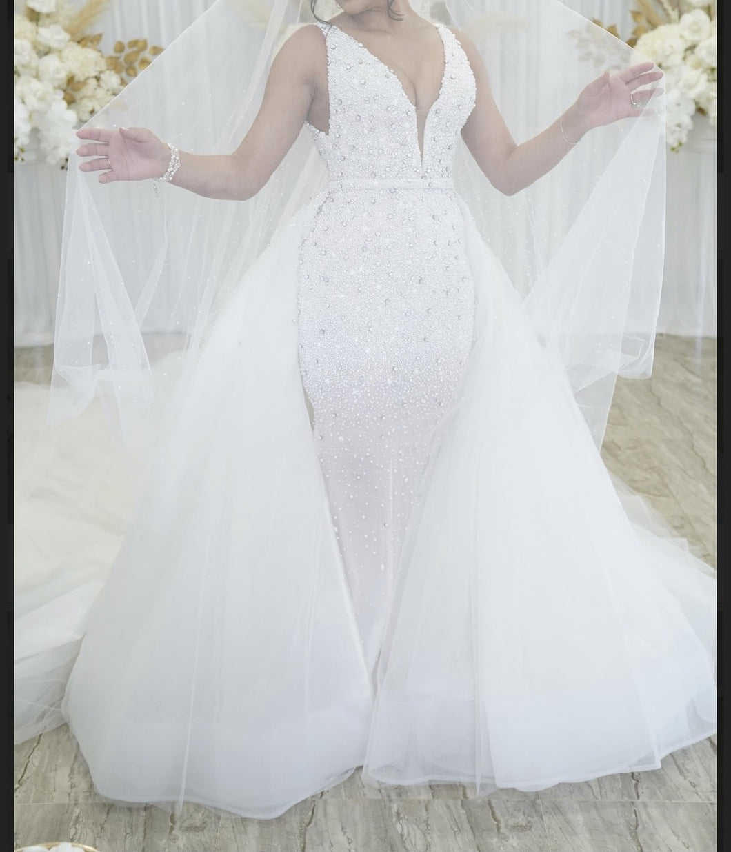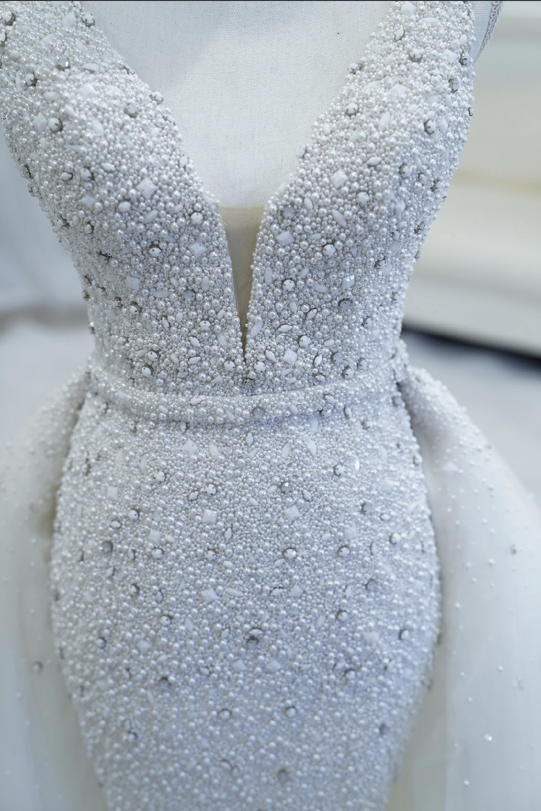 Indulge in luxury and sophistication with #style C2025-ALK63 wedding gown. Inspired by Alin Le' Kal, this fitted gown features a beaded deep v-neck and a detachable tulle overskirt. Walk down the aisle in style and grace with this exclusive piece that exudes #elegance and charm.