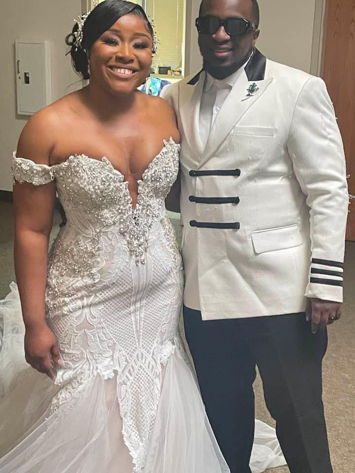 This off-the-shoulder fit-and-flare #wedding gown showcases intricate beadwork and a #graceful chapel train, blending #elegance with #modern #design. Inspired by Esé Azenabor, it highlights refined craftsmanship and a flattering silhouette that enhances your natural shape, making it a #timeless choice for your #special #weddingday.