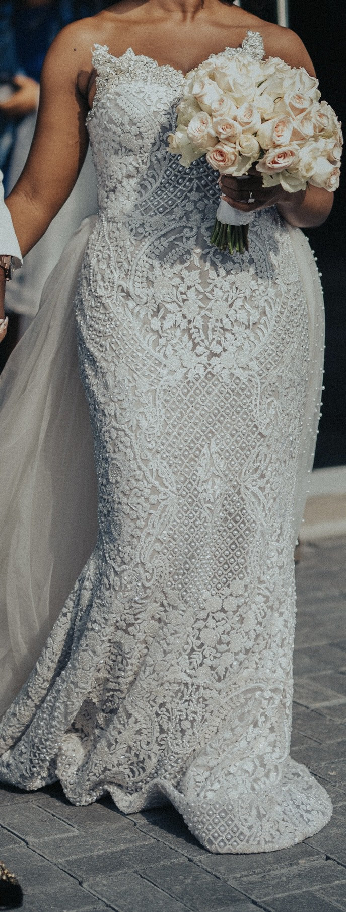 This sophisticated strapless wedding gown features exquisite beading and intricate embroidery that highlight its ornate design. The detachable overskirt adds versatility, allowing you to seamlessly transition from a refined silhouette to a more dramatic, layered look. Ideal for brides who desire both elegance and adaptability on their special day.