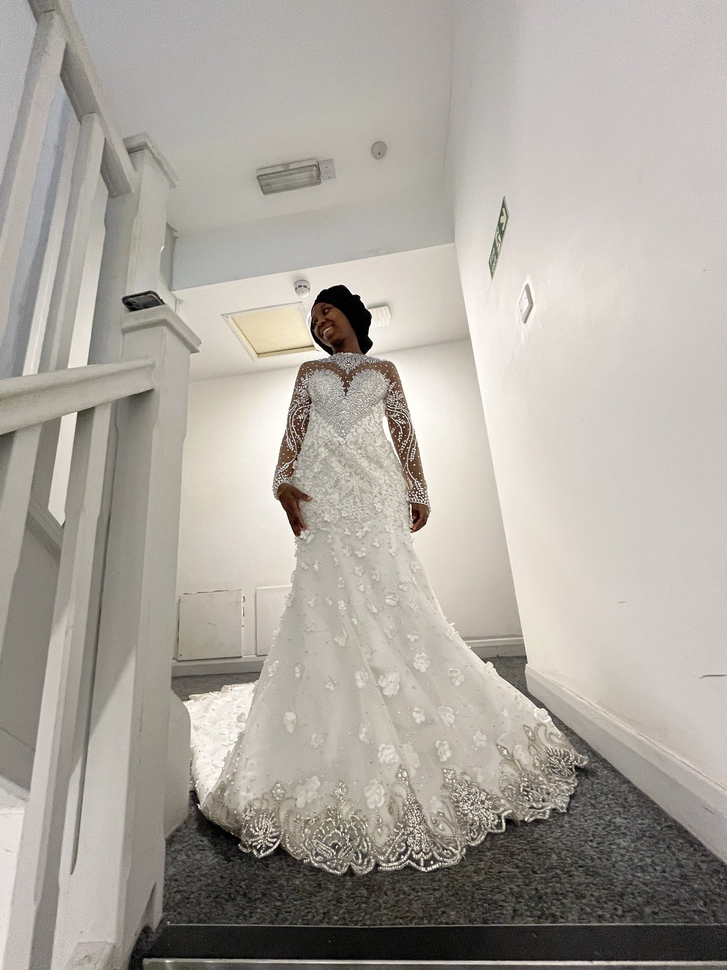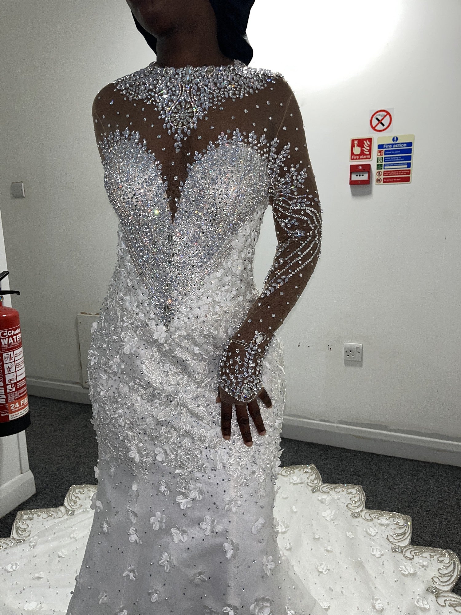 Elevate your bridal look with this stunning long sleeve wedding gown, richly embellished with sparkling bling beadwork that catches the light from every angle. It features a dramatic couture train that flows with regal elegance. Perfect for the bride who wishes to make a lasting impression, this gown combines timeless sophistication with modern glamour, ensuring you feel radiant and unforgettable on your special day.