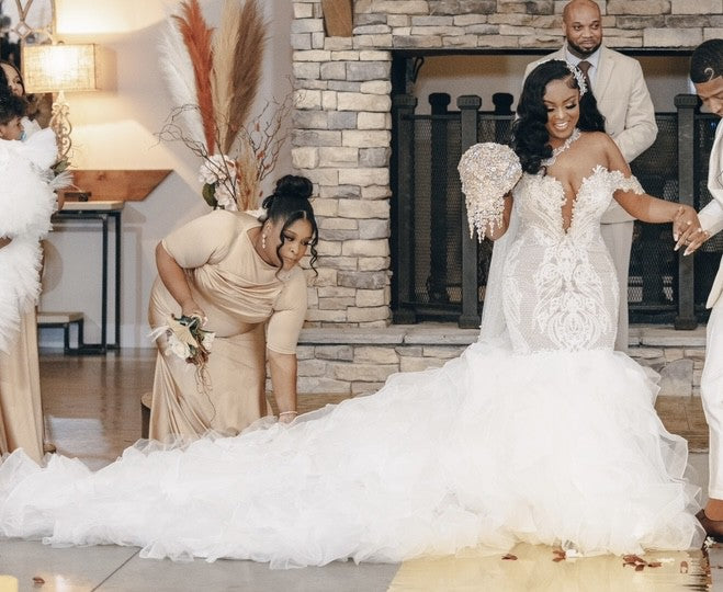 This exquisite off-the-shoulder, strapless wedding gown combines a flattering fit-to-flare silhouette with intricate embroidery for a timeless elegance. It features a dramatic cathedral-length ruffled train that adds breathtaking movement and sophistication. Perfect for the bride seeking a blend of modern style and classic grandeur on her special day.