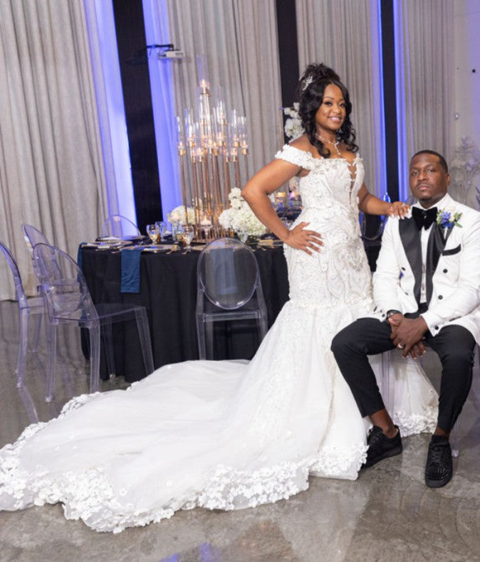 Experience timeless elegance with this off-the-shoulder fit-and-flare wedding gown, beautifully detailed with intricate beaded embroidery. The design contours your silhouette flawlessly, while the chapel train adds a graceful, sweeping finish. Perfect for brides seeking a blend of classic charm and modern sophistication on their special day.