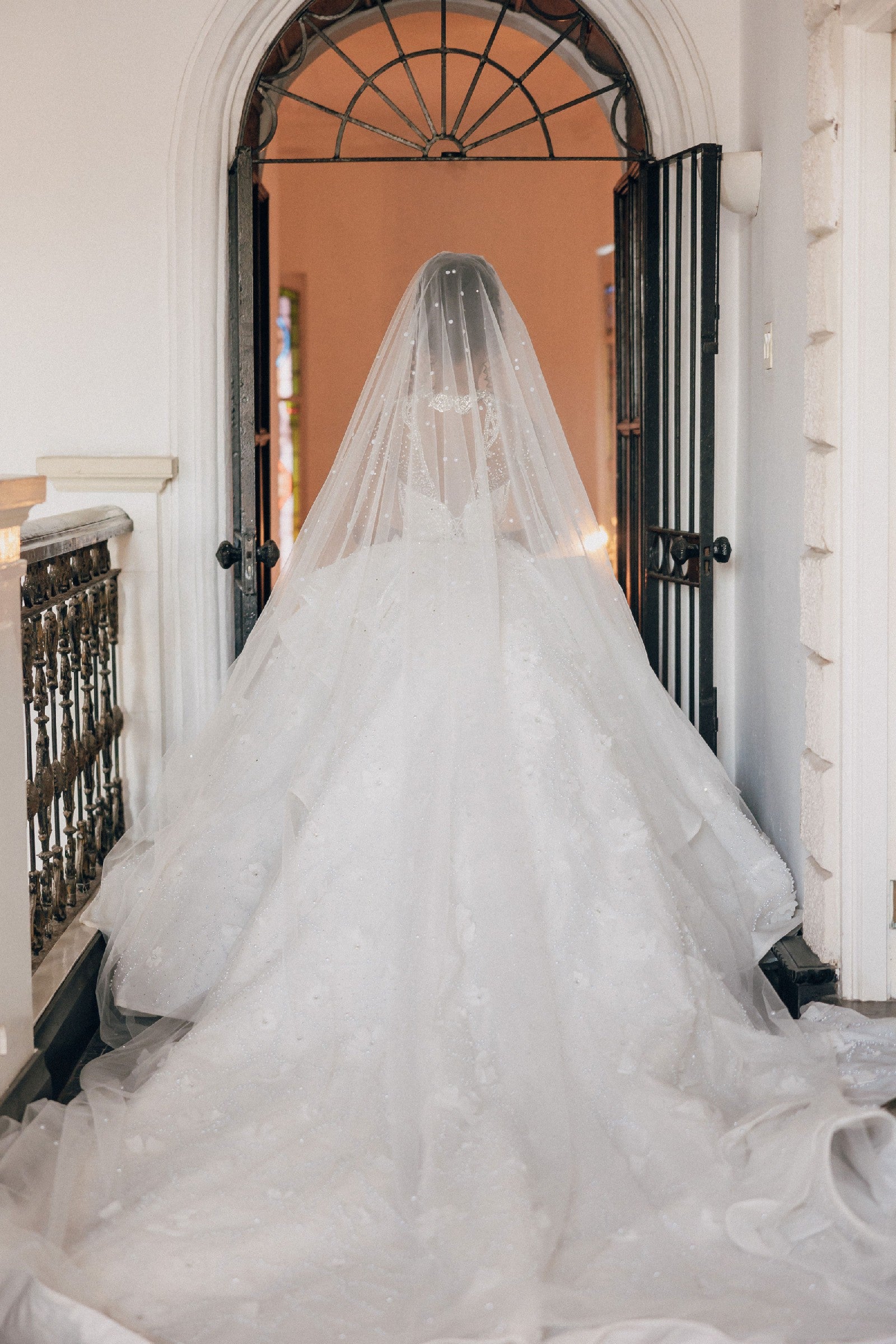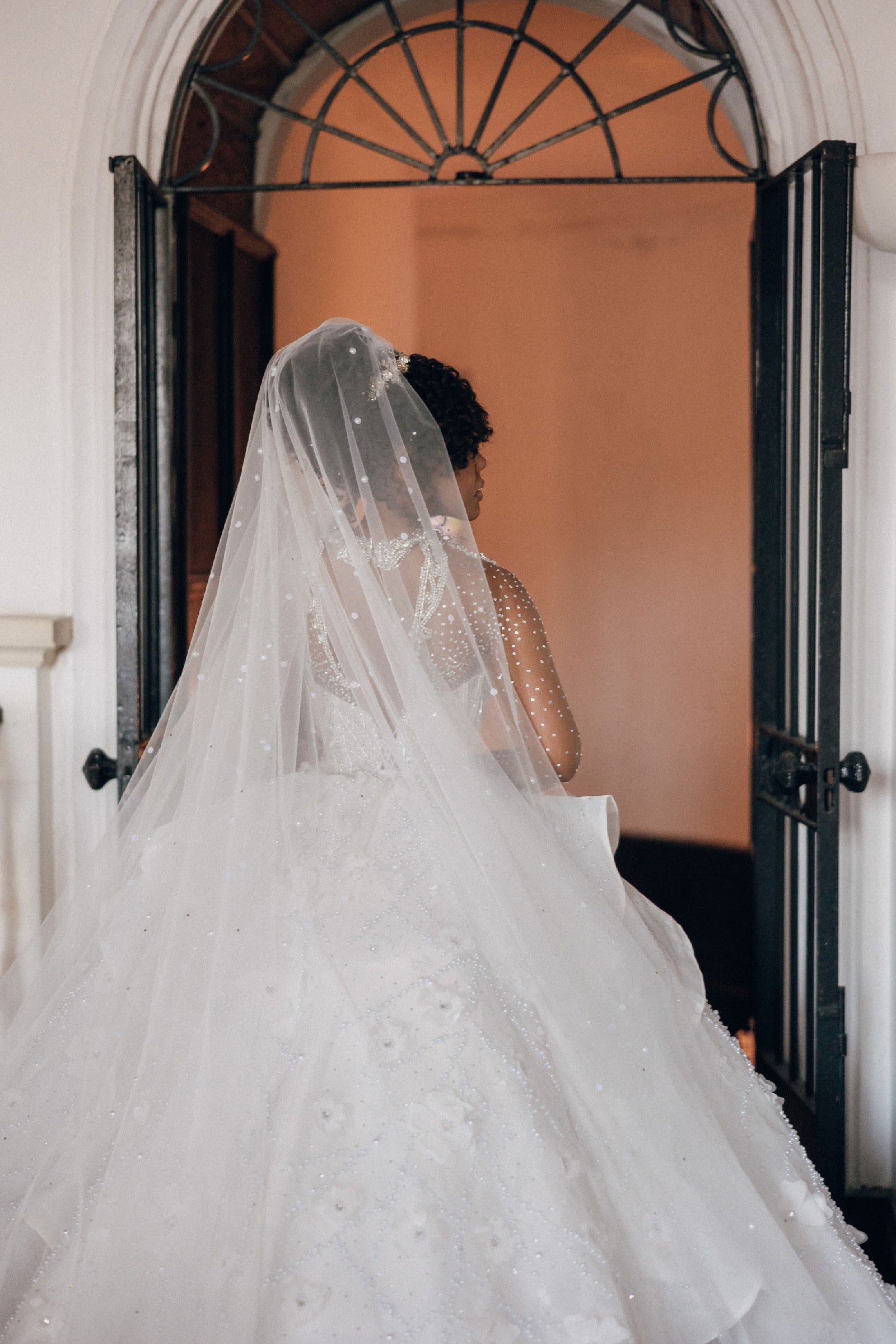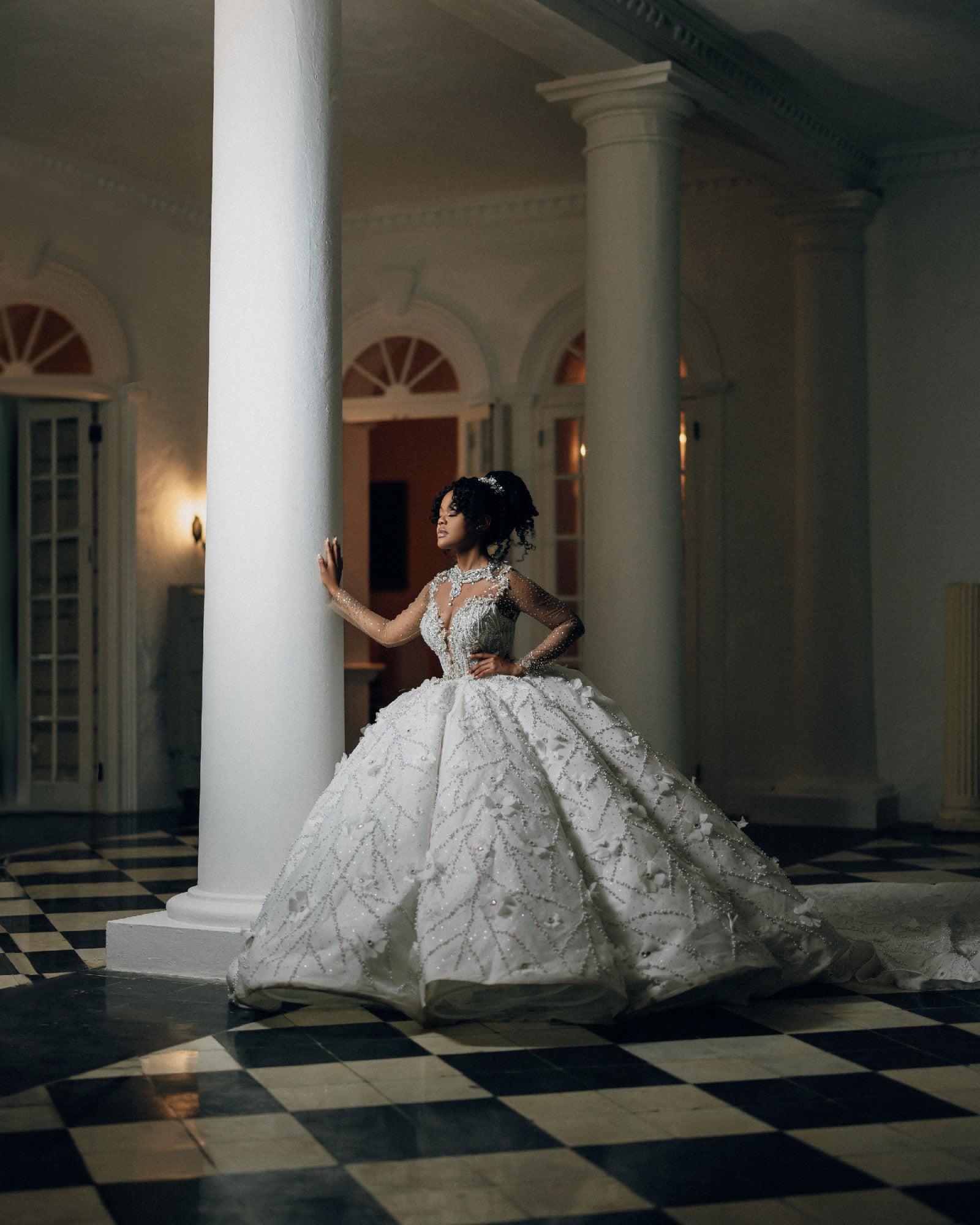 Elevate your bridal elegance with this crystal-embellished ball gown, featuring a stunning bling collar that catches the light beautifully. The dress combines timeless sophistication with modern grace through its sheer long sleeves, adding a delicate, ethereal touch. Designed to make your special day unforgettable, this gown promises both glamour and refined style as you walk down the aisle.