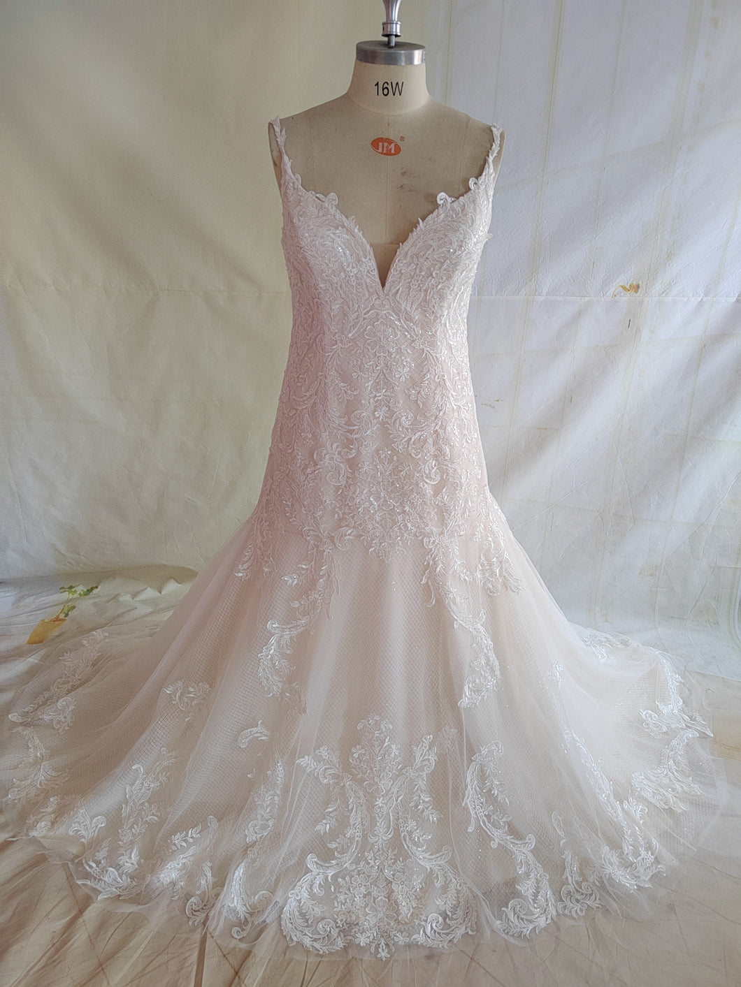 Este vestido de novia de encaje de talla grande, sin mangas y con cuello abierto, es una opción en cualquier talla y con cualquier personalización.