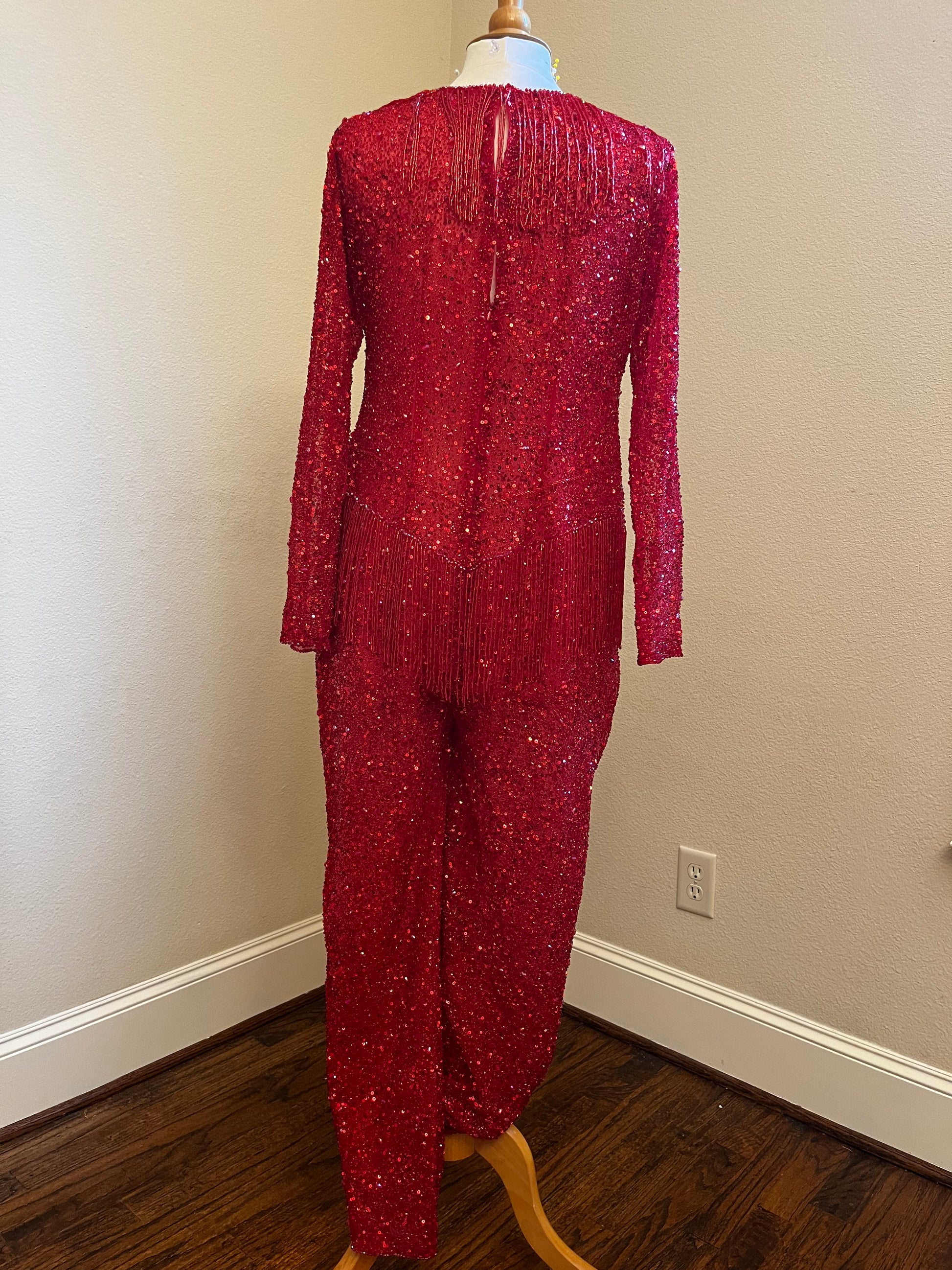 Esta es una réplica de un traje pantalón rojo de manga larga con pedrería de Reba McEntire que un cliente nos pidió que hiciéramos para su desfile. Esto podría usarse para un #concurso o cualquier otra #ocasión especial. Podemos rehacer esta prenda #formal para ti en cualquier color, talla o con cualquier cambio de #diseño.