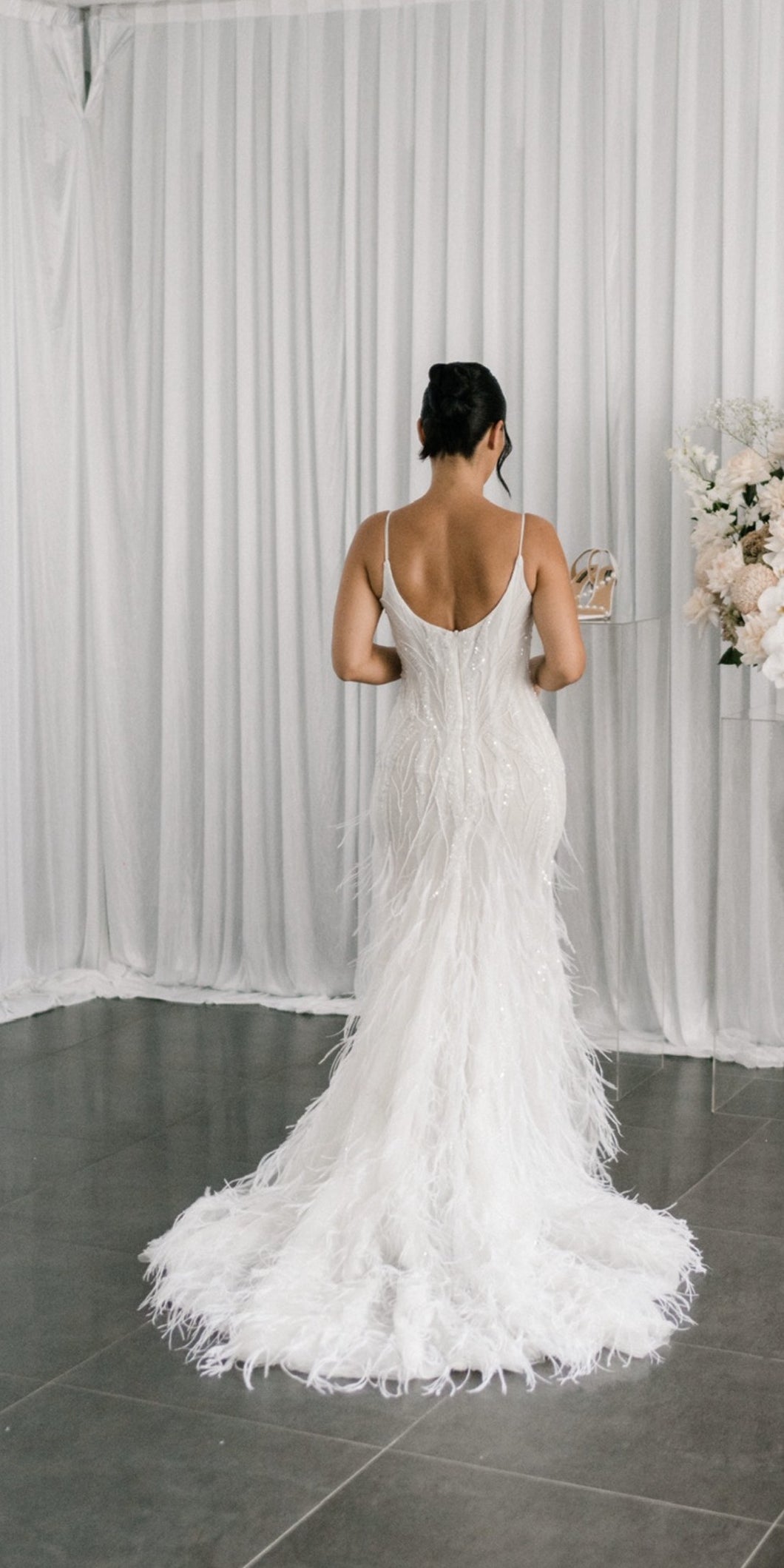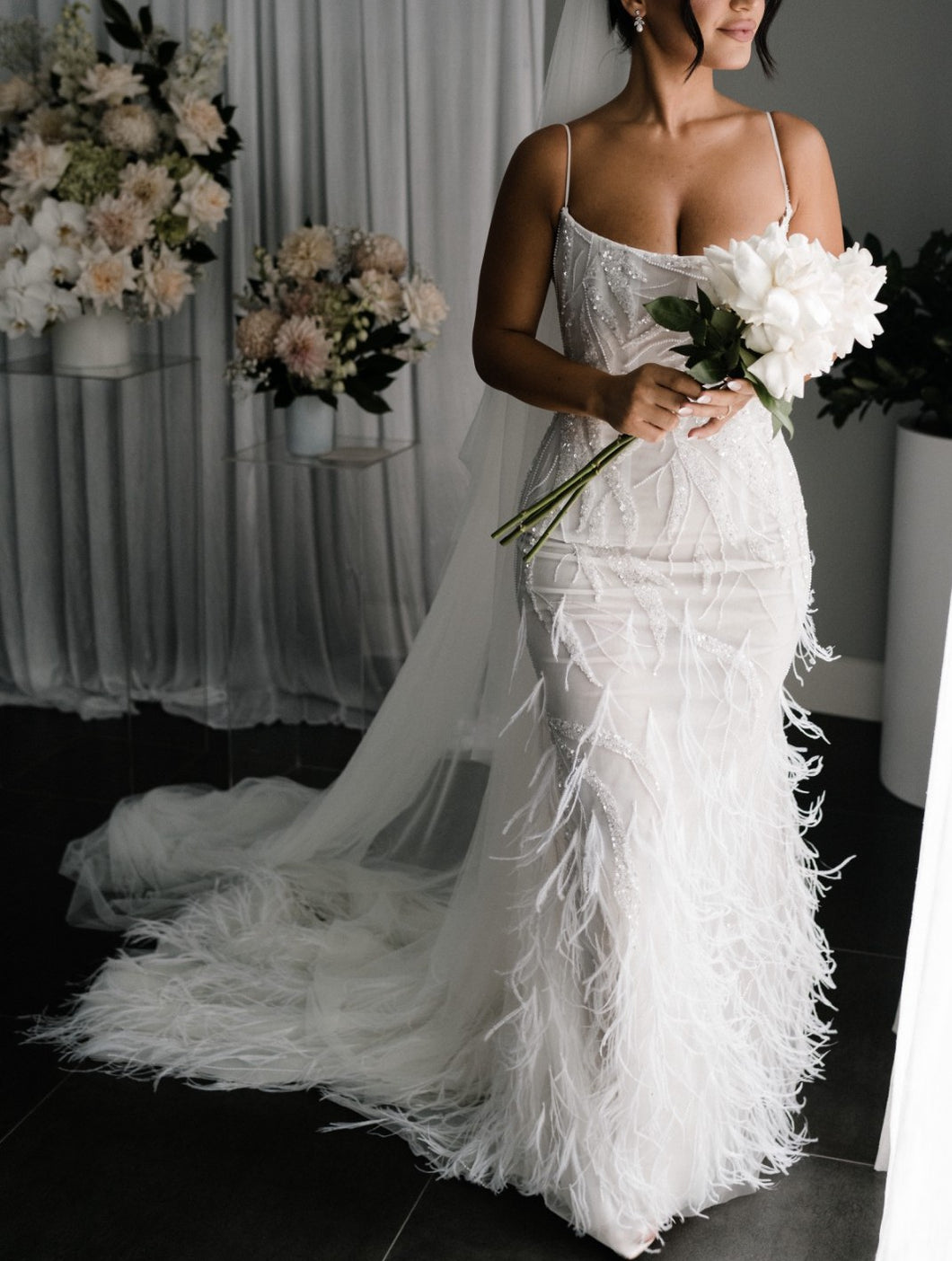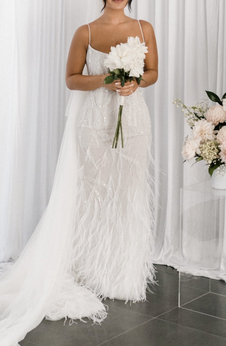 C2024-FF302 - fitted wedding gown with beading, feathers and spaghetti shoulder strap