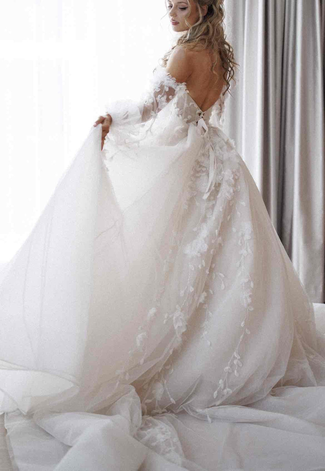 C2024-LSg27 - Robe de bal de mariée Bishop à manches longues avec décolleté à épaules dénudées.