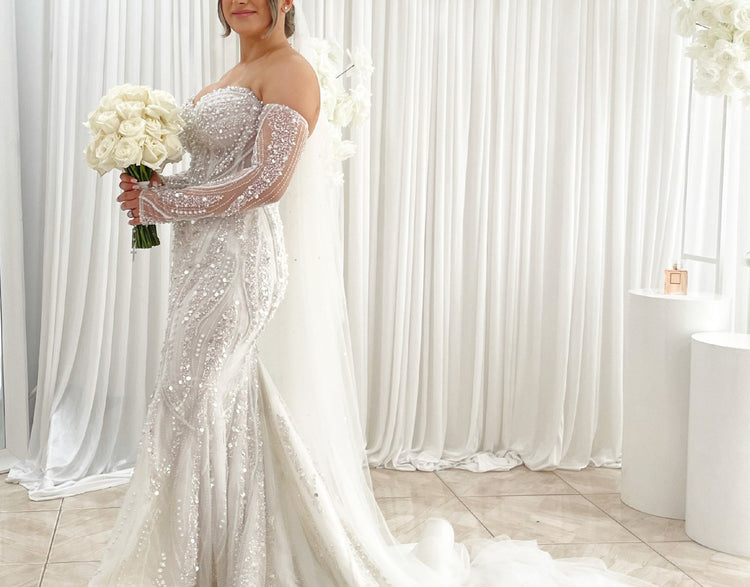 Offrez-vous l'élégance avec notre robe de mariée bustier perlée C2024-SLS659. Les perles complexes ajoutent une touche de luxe à votre journée spéciale, tandis que les manches transparentes amovibles offrent polyvalence et confort. Adoptez la beauté intemporelle dans ce design exclusif.