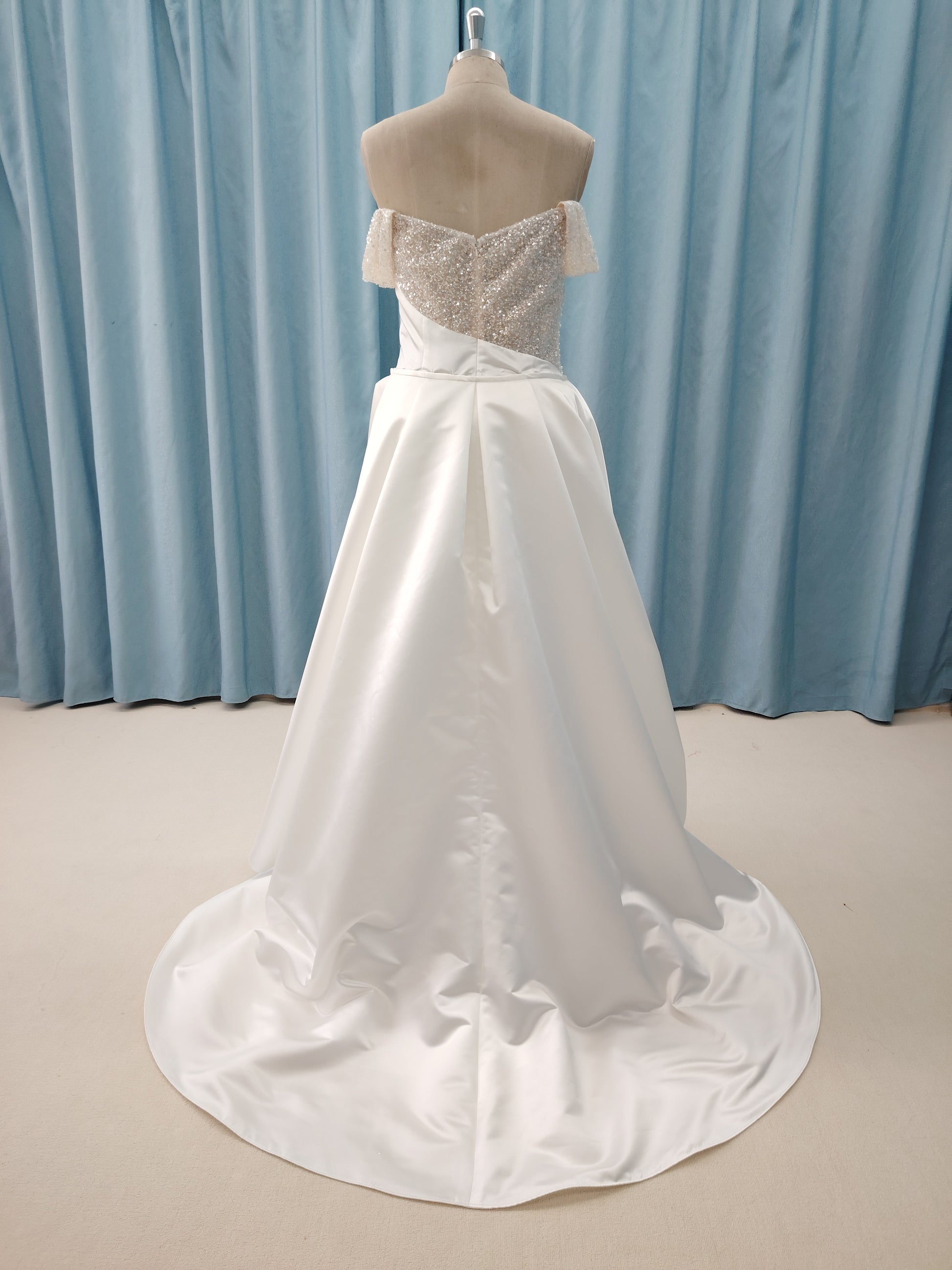 Get this plus size off the shoulder beaded bodice wedding gown customized in any way.