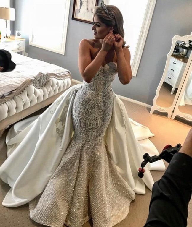 This is a popular strapless fit-and-flare beaded wedding gown that you can have customized however you need.