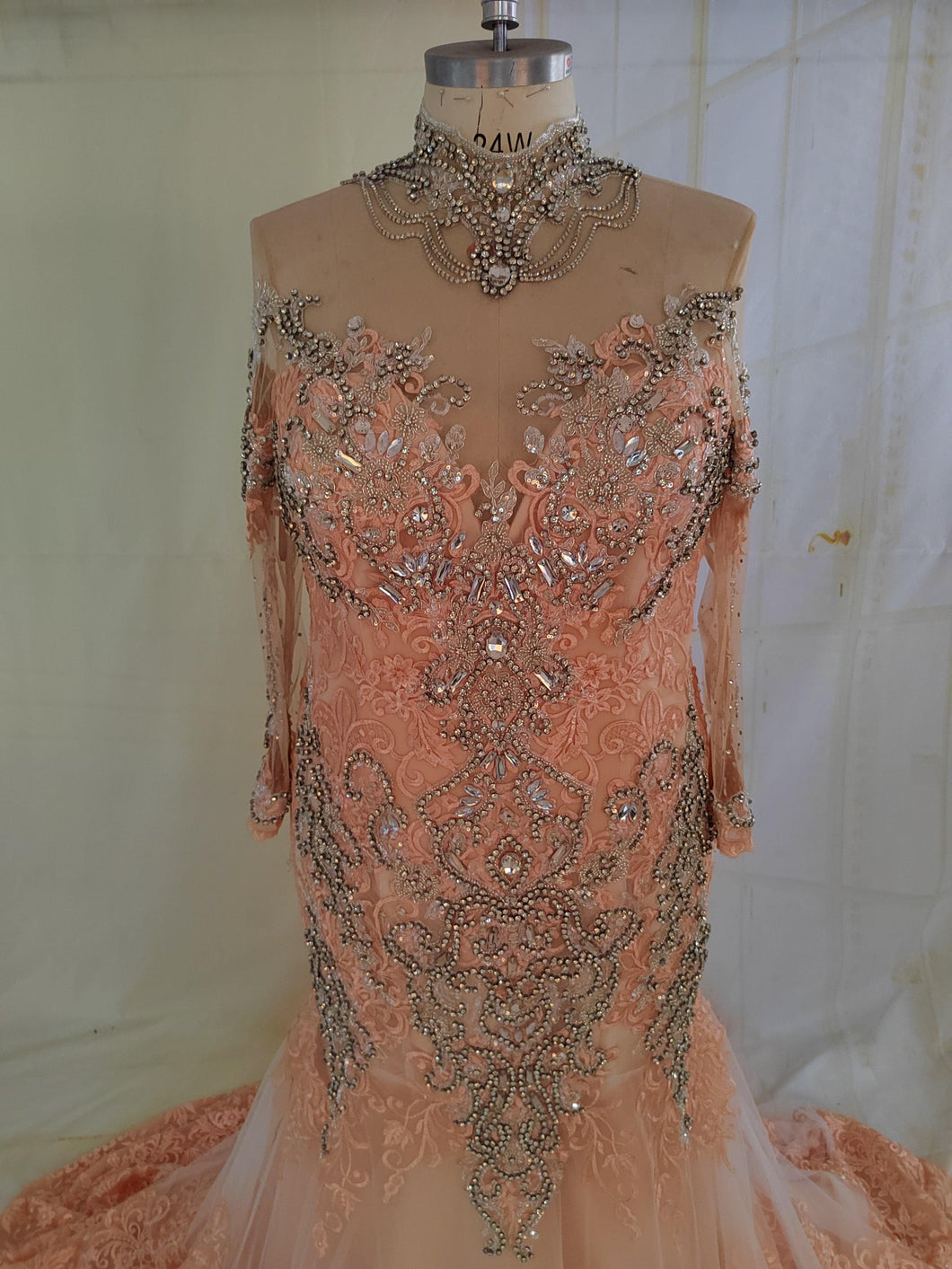 In stock in a size 28 as shown. Or have this pastel long sleeve plus size wedding gown made to order in any size and with any changes.