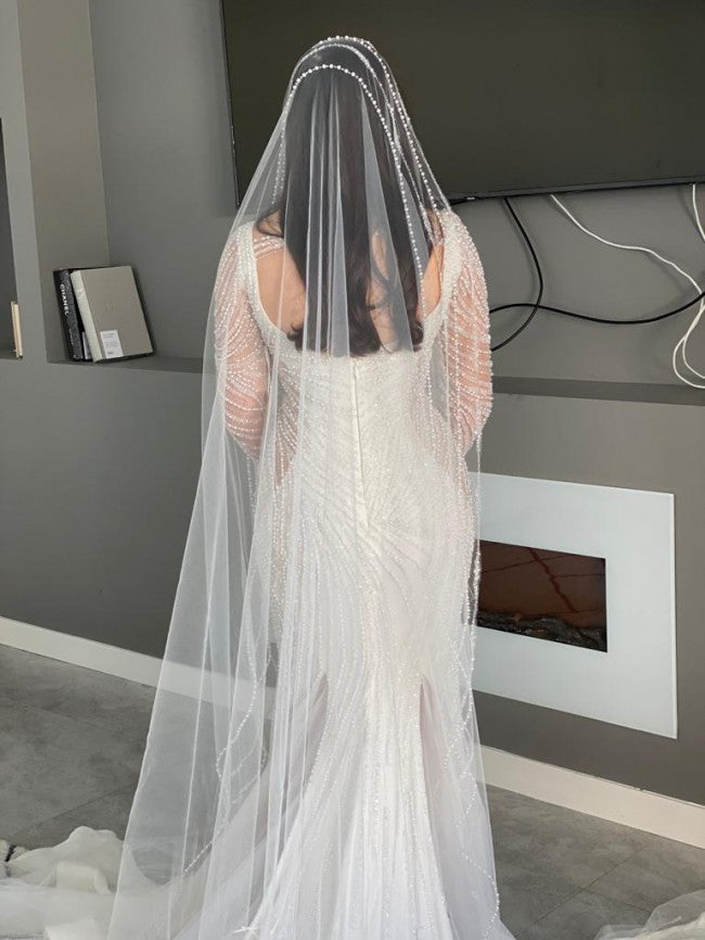 Here is a sheer beaded long sleeve scoop neck wedding dress you can customize in any way if needed.