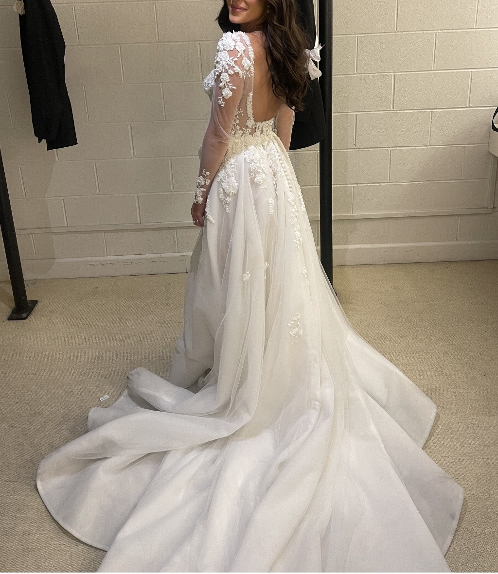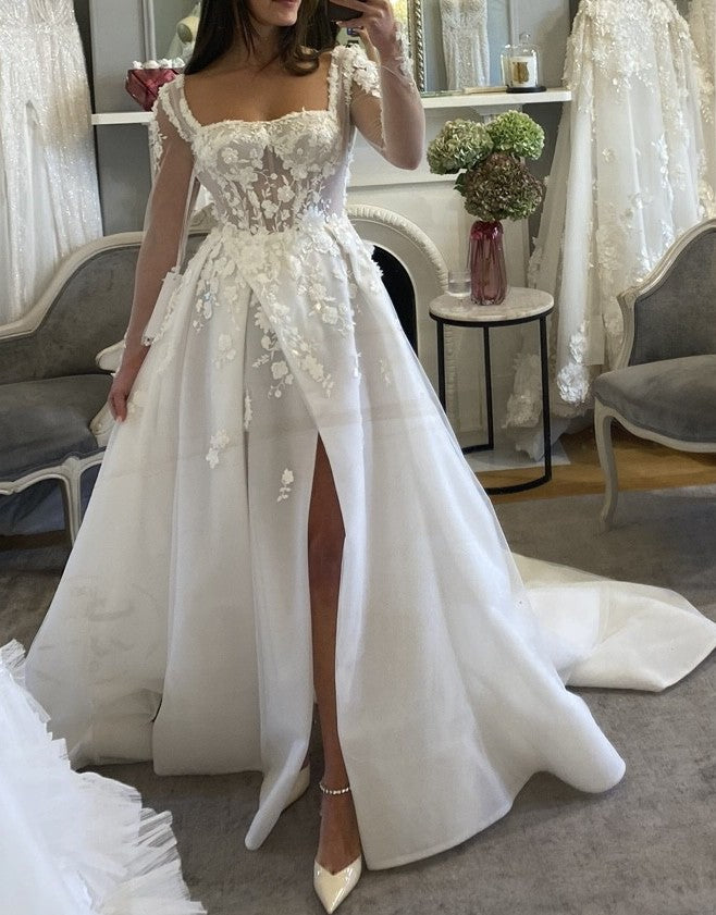C2023-LS16K - sheer long sleeve open neck line wedding dress with side split and train