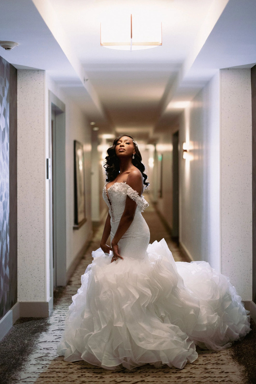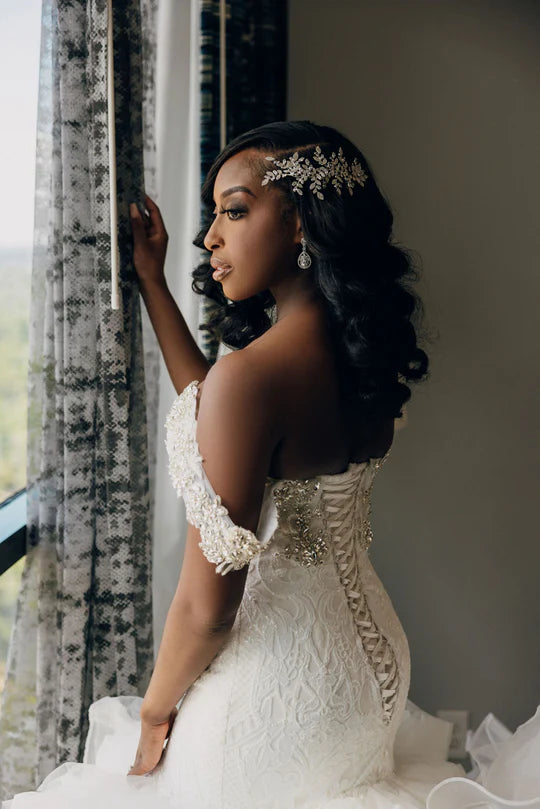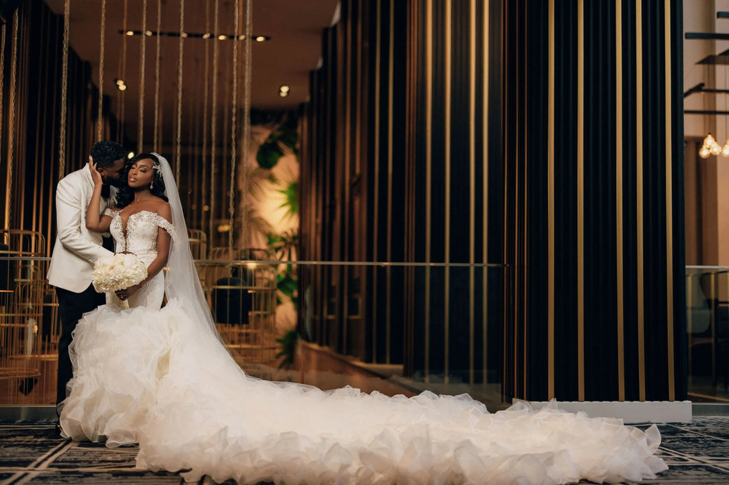 Classically #elegant and sophisticated, this off-the-shoulder, strapless #gown encapsulates the essence of true grace. Its fit-to-flare silhouette hugs the body while its layers of intricate lace and ruffle bottom train flutter gracefully as you walk. The back ties up in a #traditional lace-up closure for the #perfect fit. #Timeless and #exquisite, this gown is #perfect for the #special #weddingday.