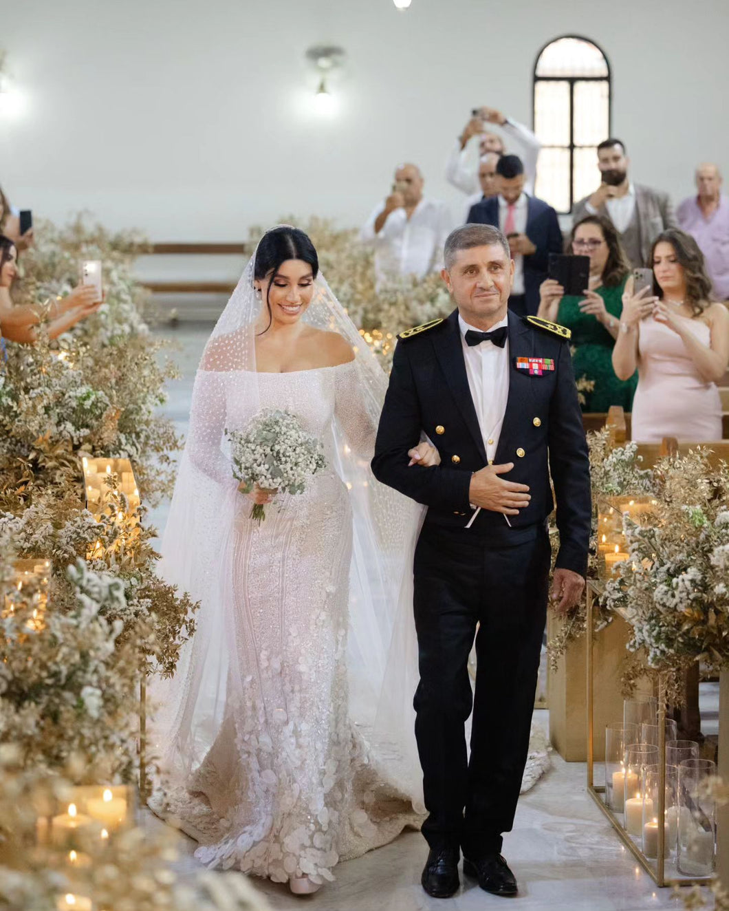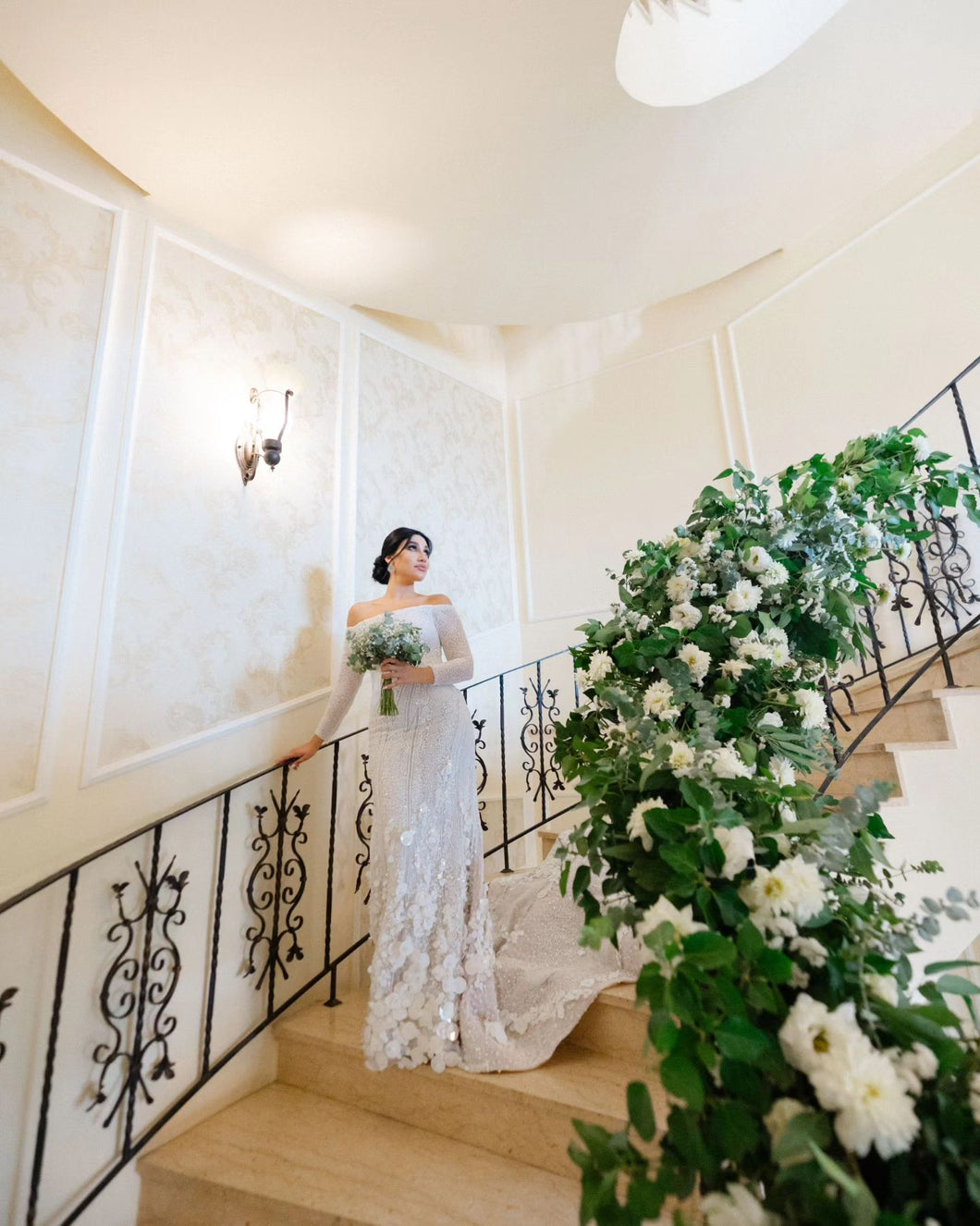 This off the shoulder long sleeve wedding gown is a masterpiece of luxury and elegance. An exquisite 3D embellishment leaves a lasting impression, perfect for making a striking entrance at your wedding. Invest in the exquisite style of this timeless piece to make your special day truly memorable.